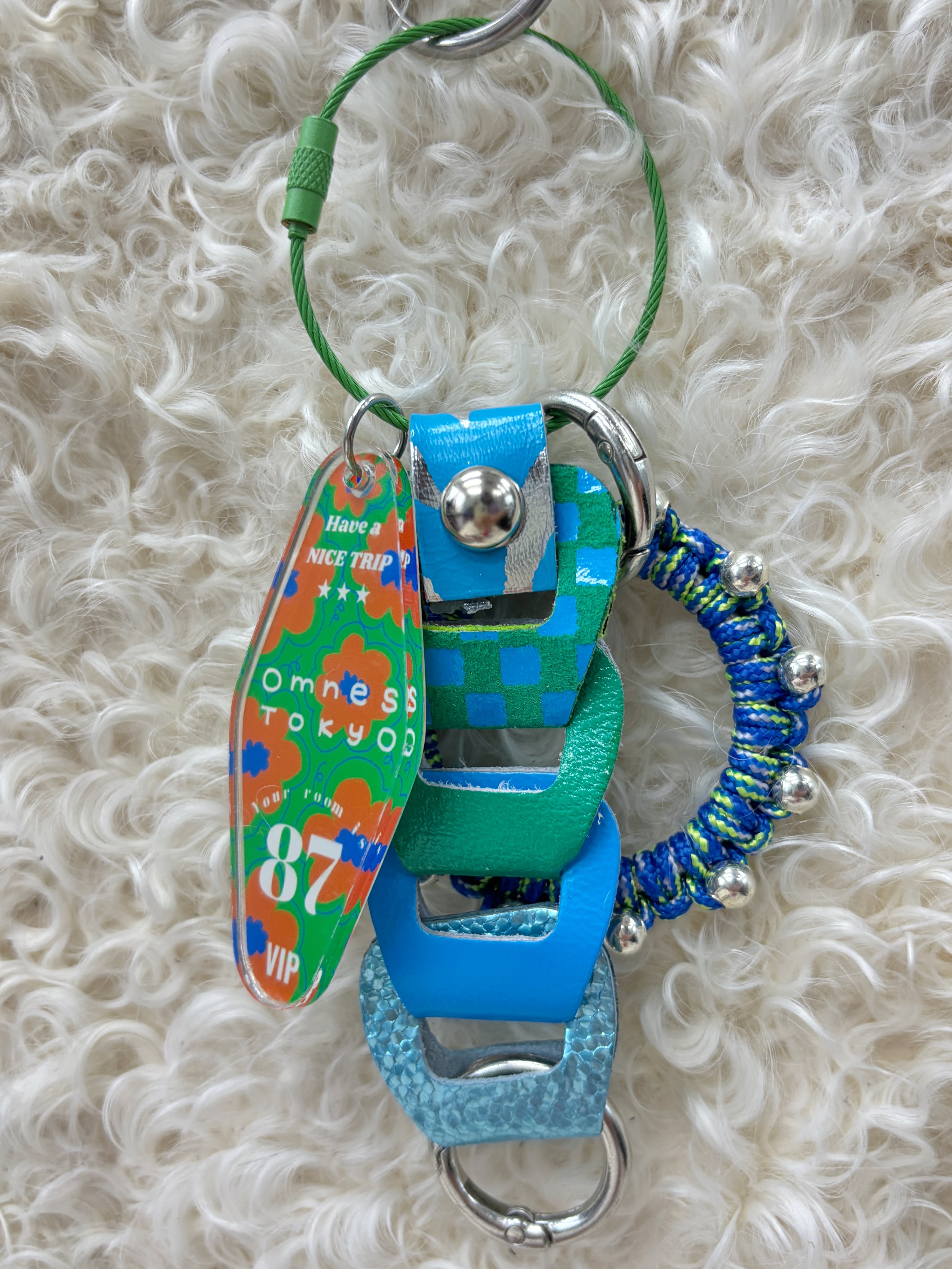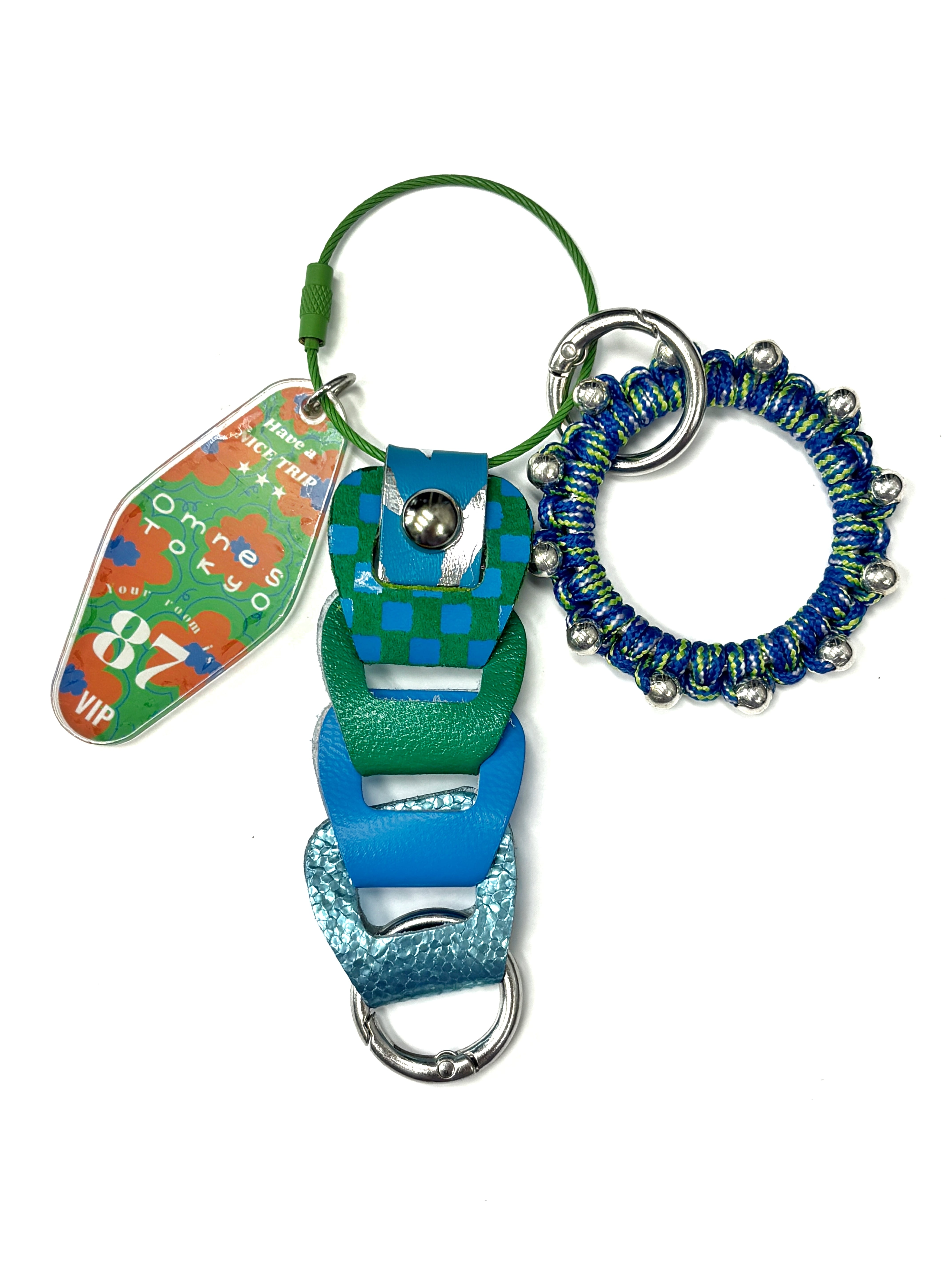 全てオリジナルで制作したアクリルパーツやパラコードのチャーム、レザーパーツを組み合わせたキーリング。