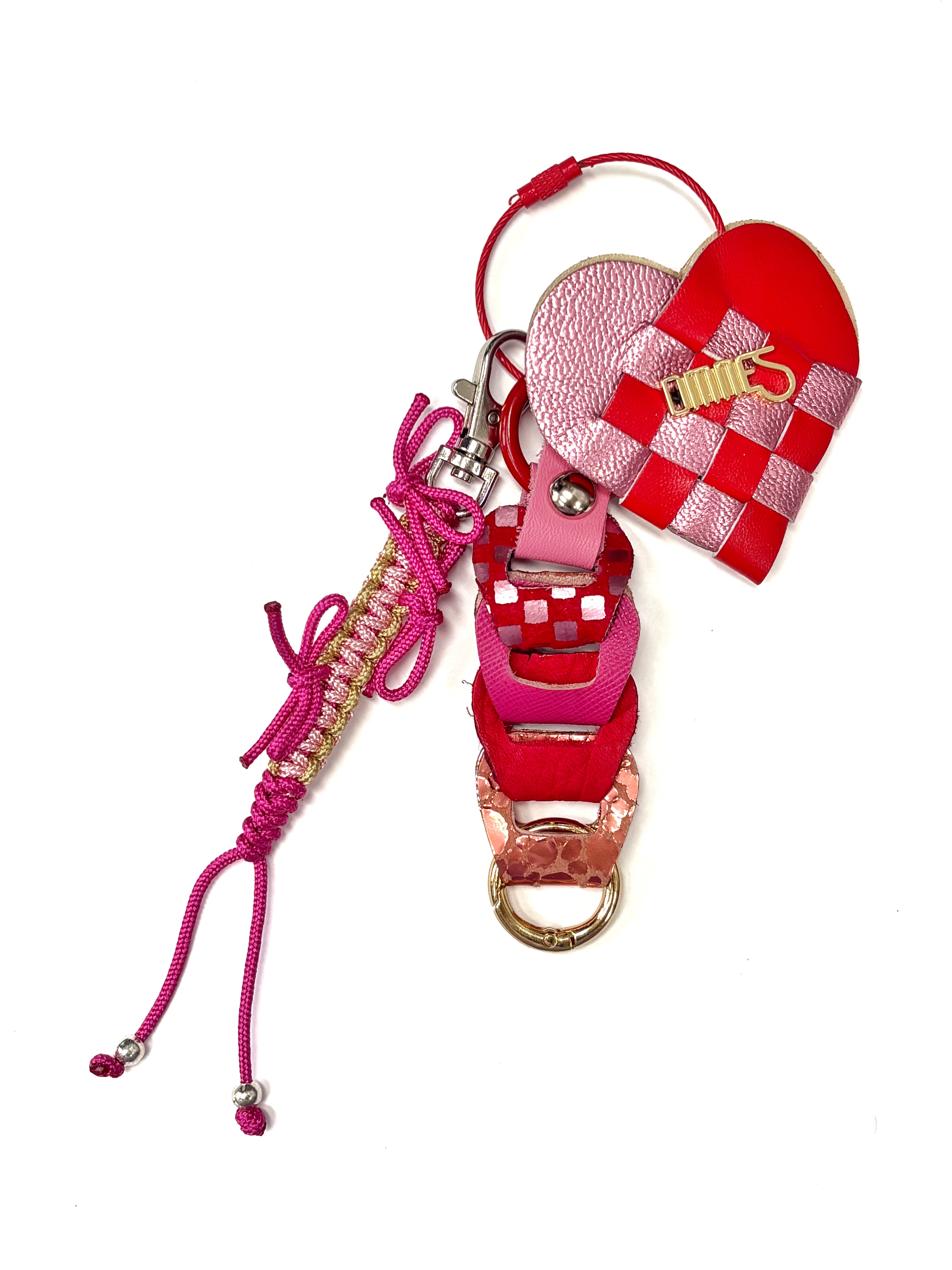 2枚の革を織り合わせて作られた小さなハートのキーリングAmuheart。