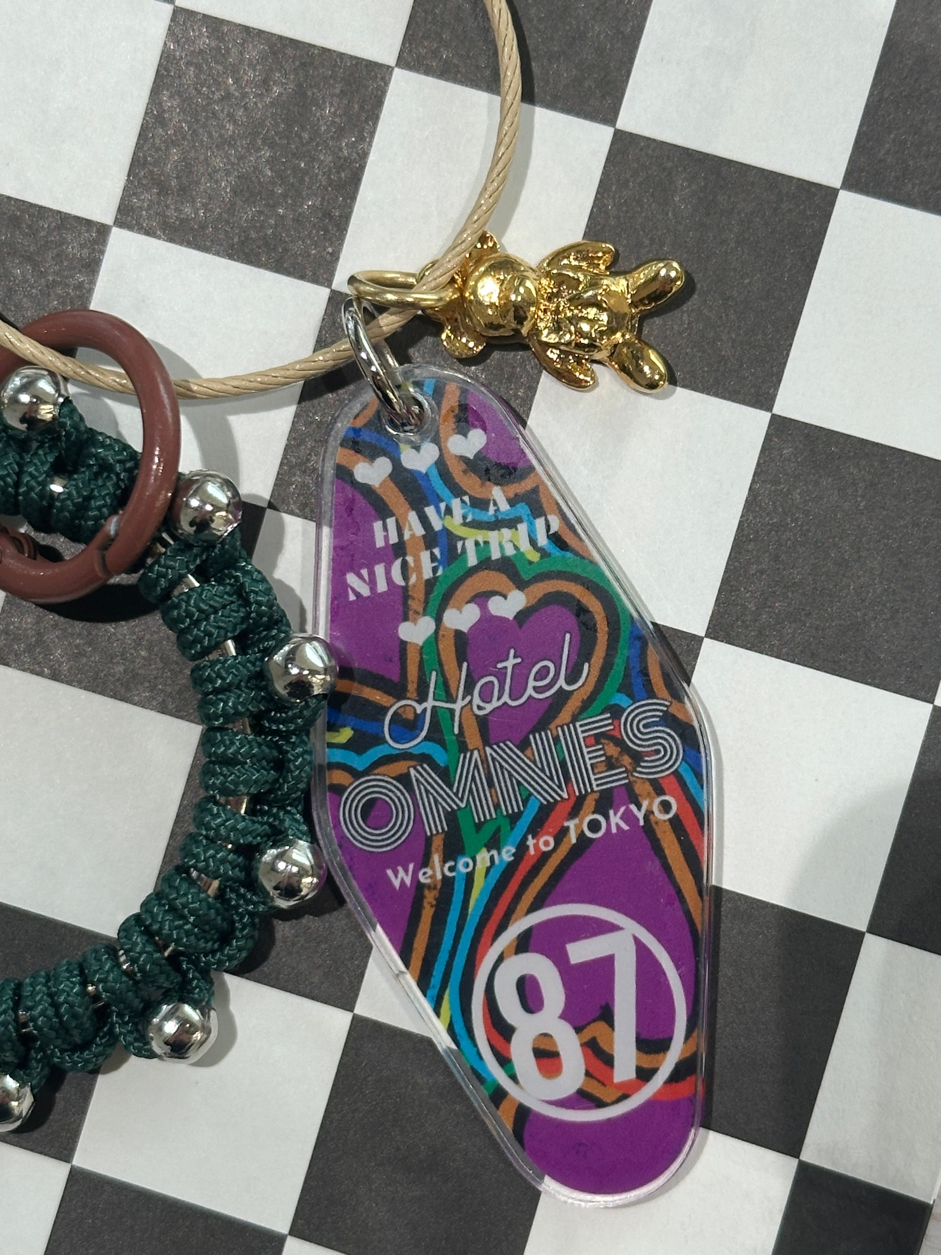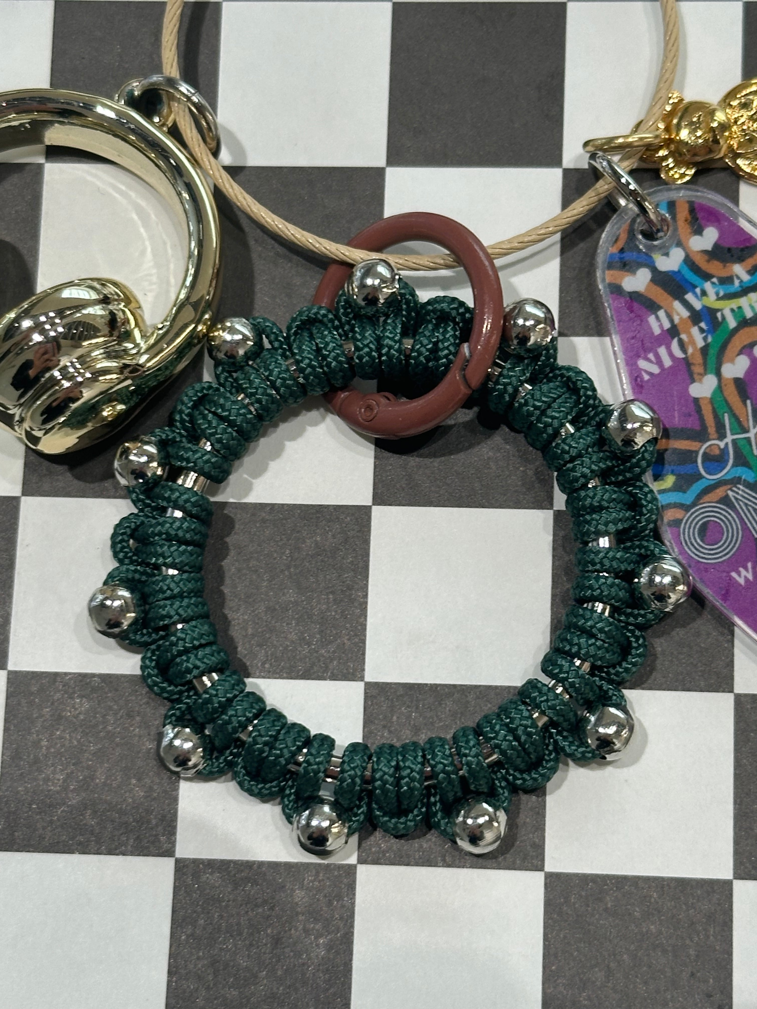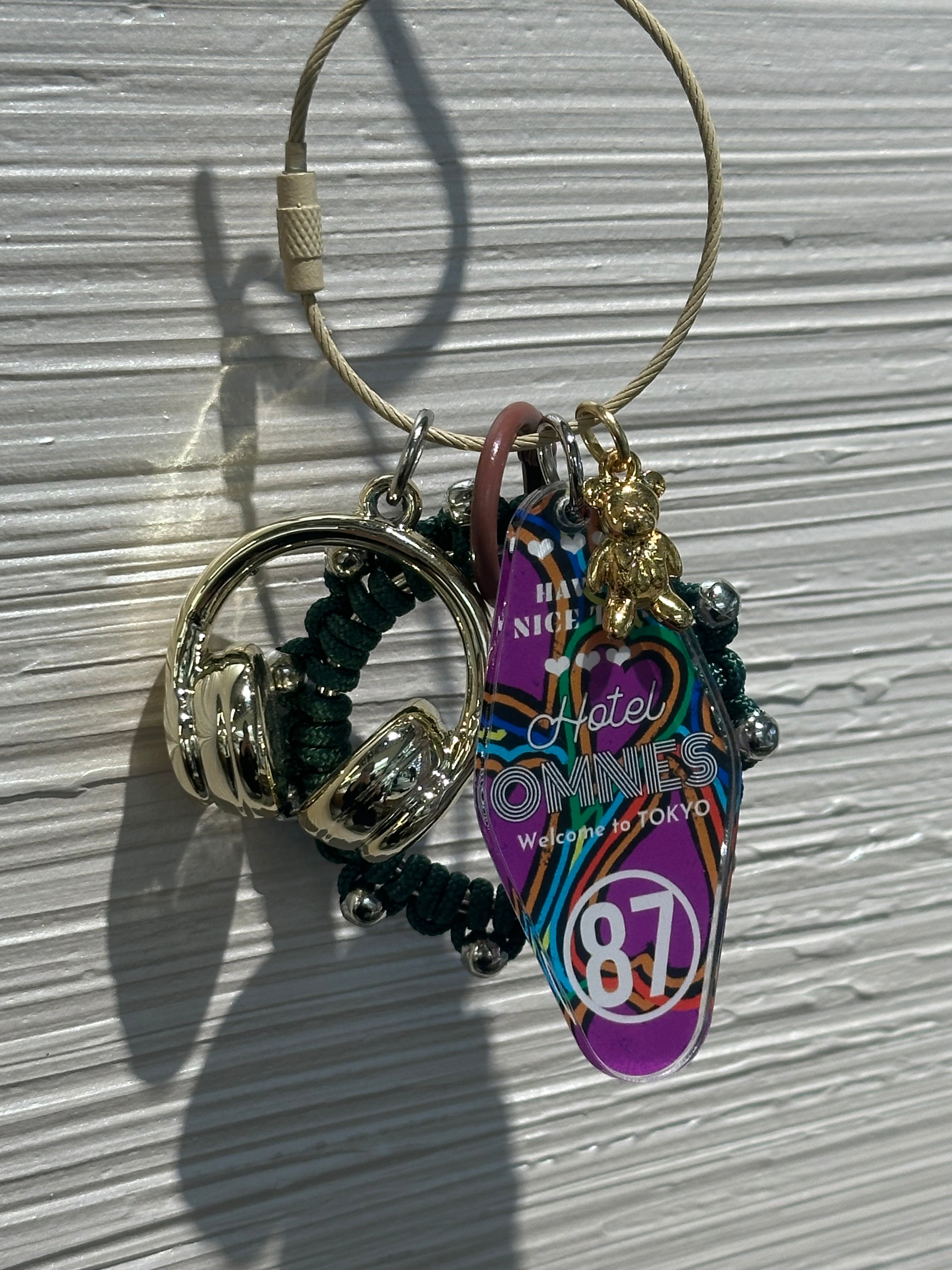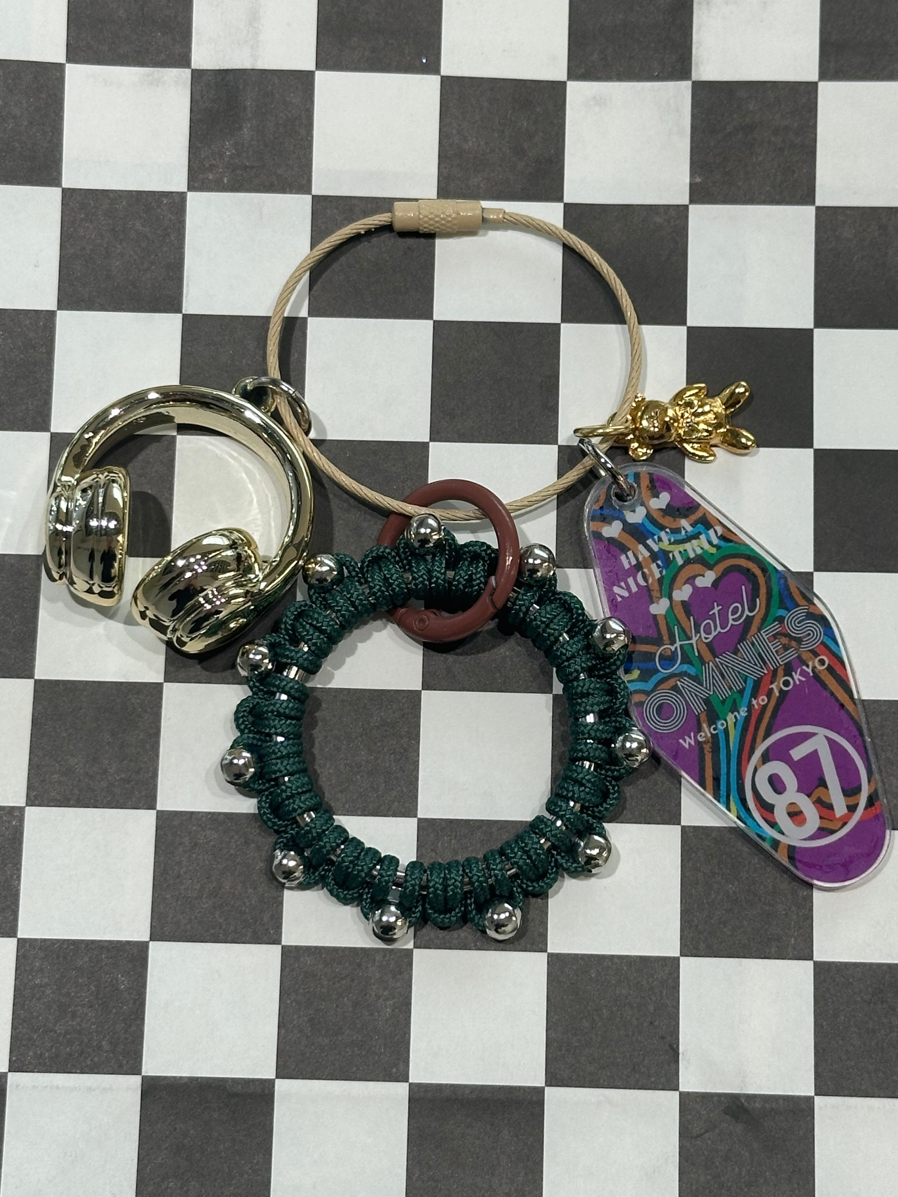 全てオリジナルで制作したアクリルパーツやパラコードのチャーム、レザーパーツを組み合わせたキーリング。
