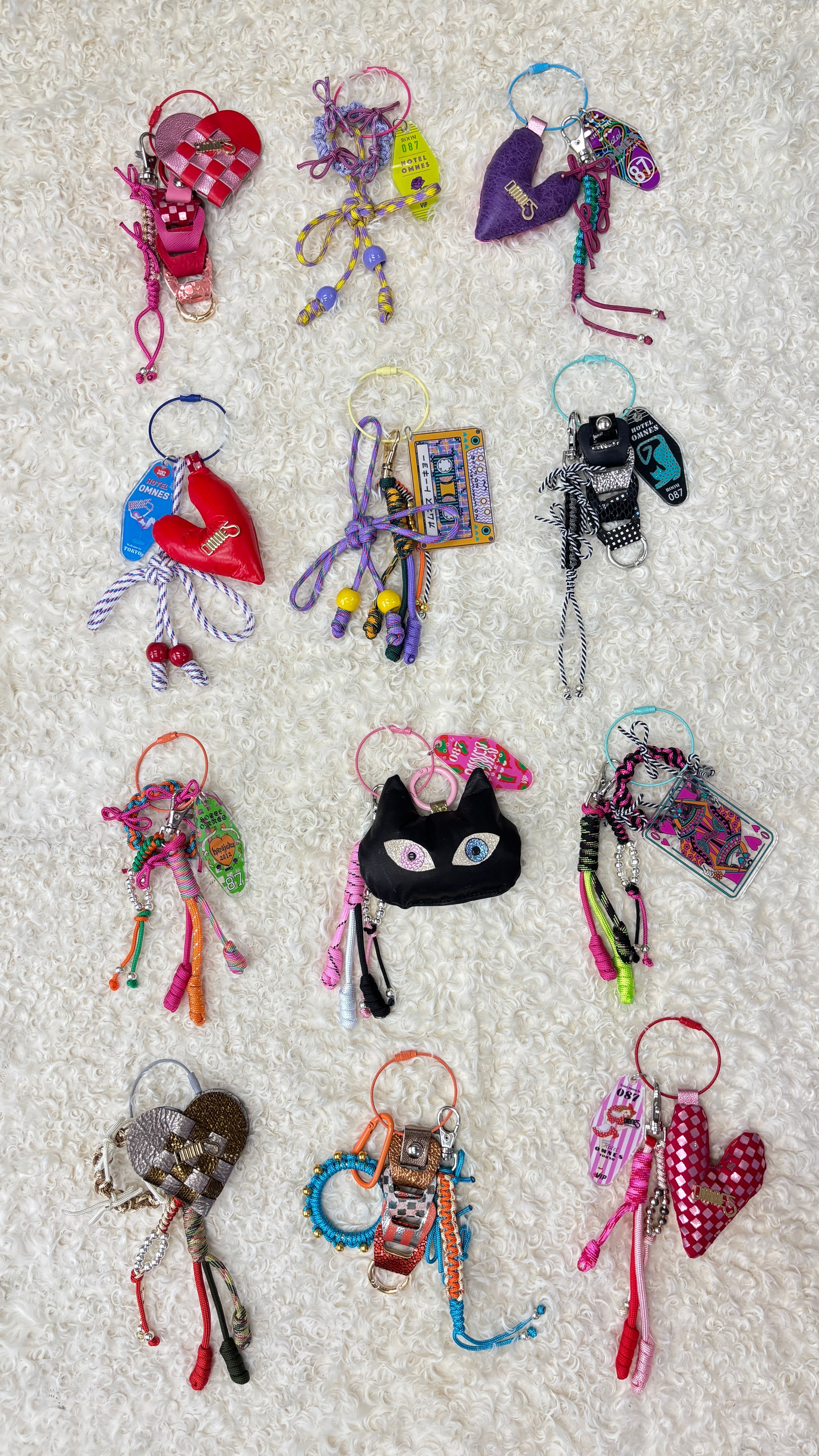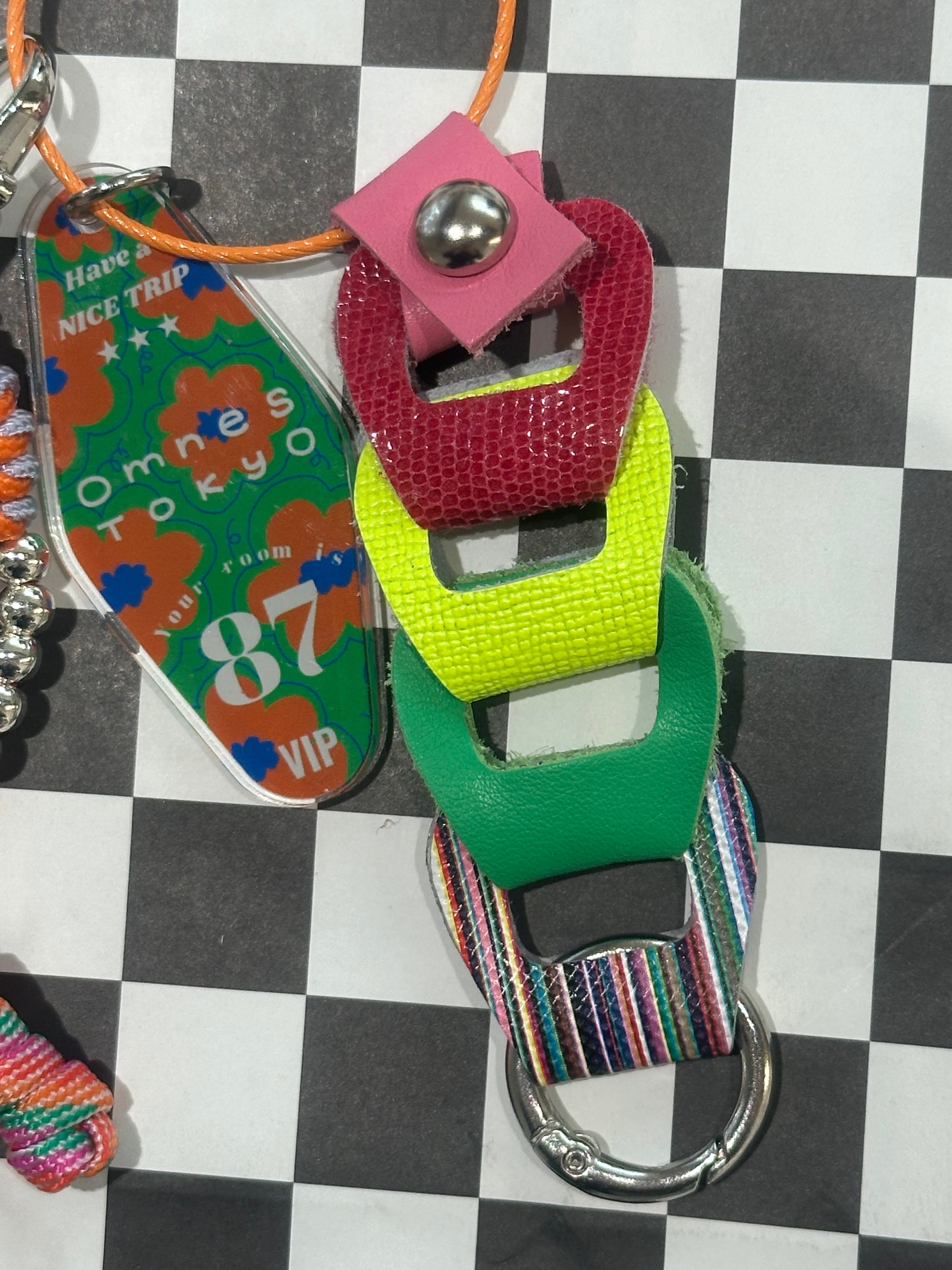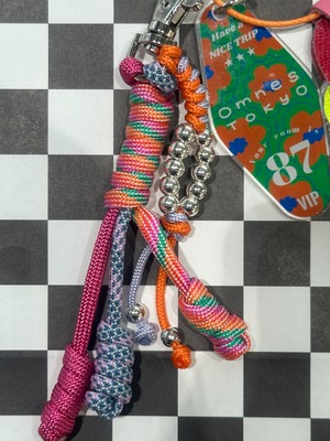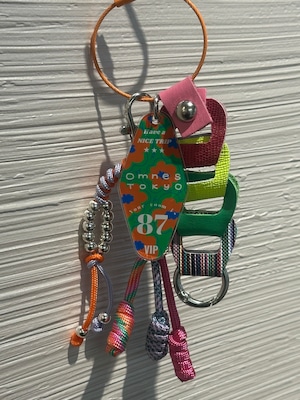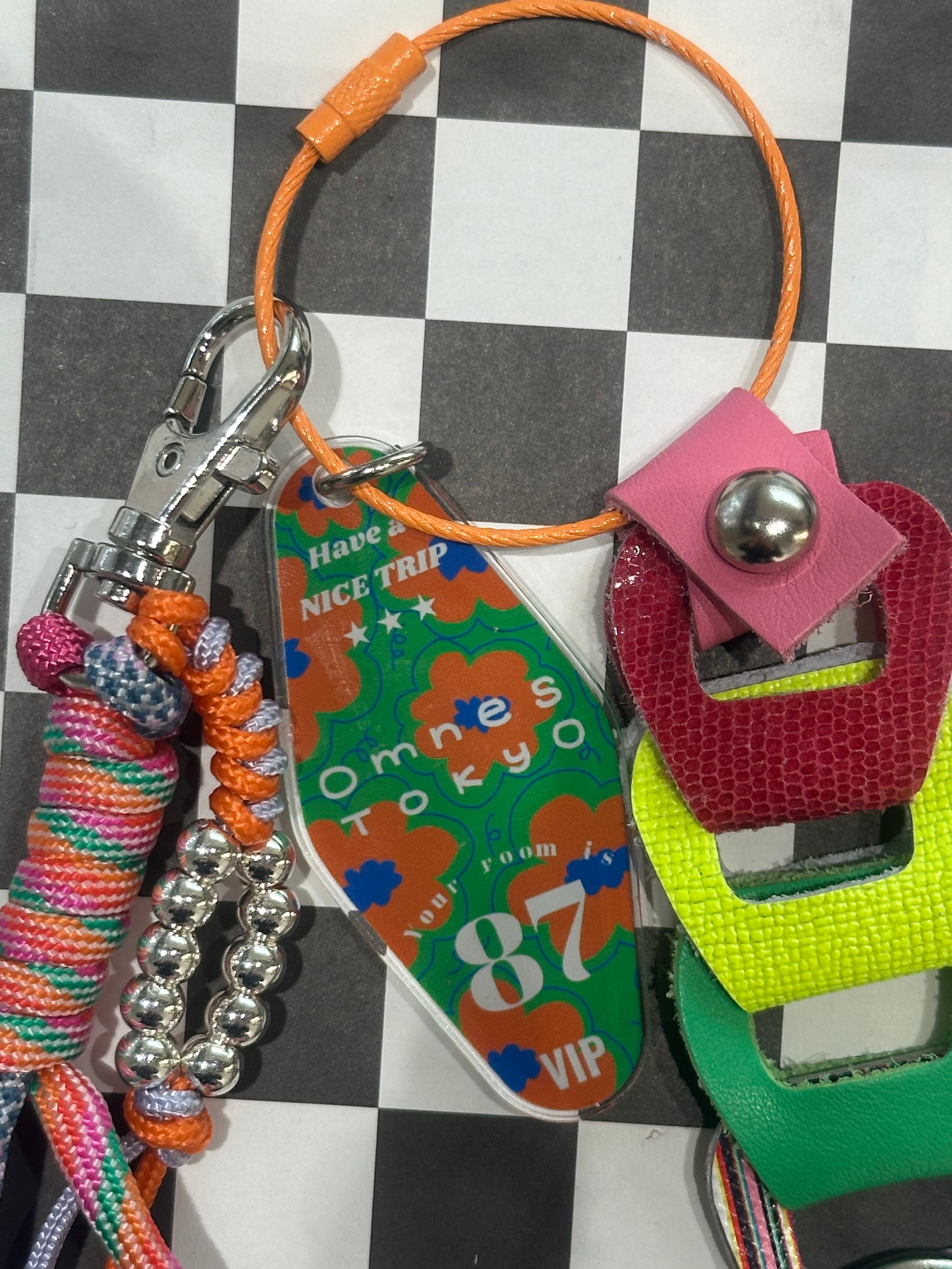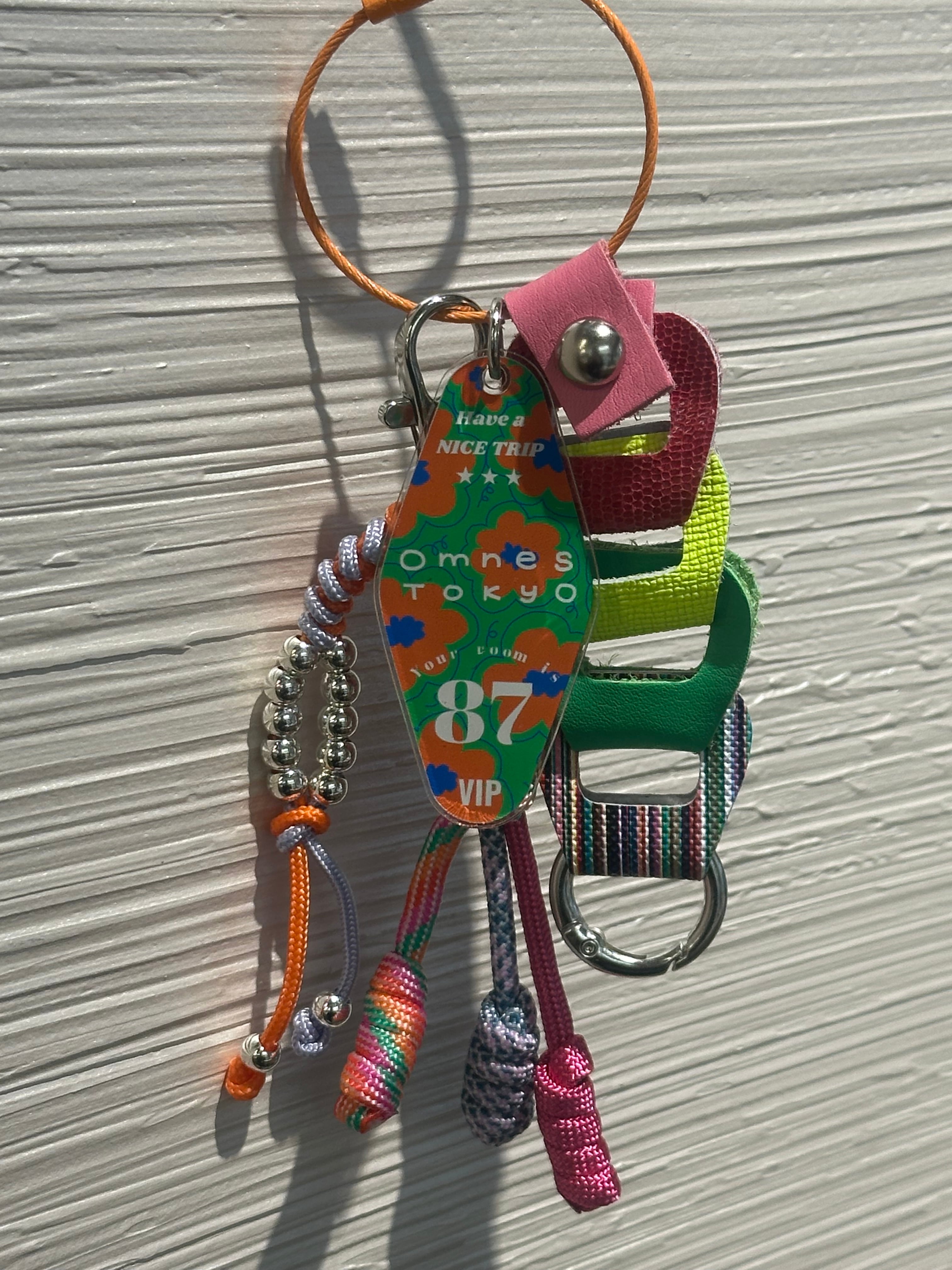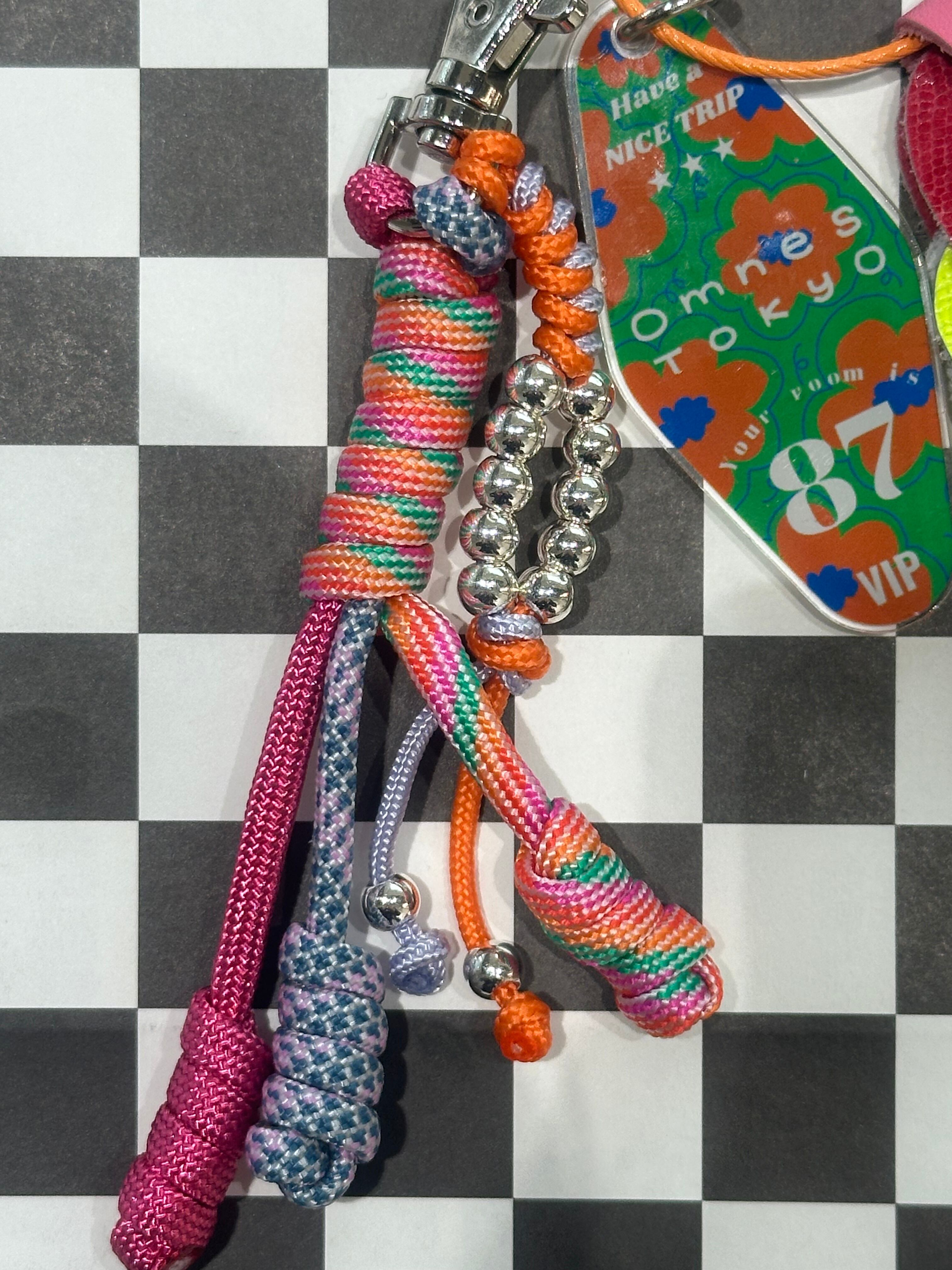 全てオリジナルで制作したアクリルパーツやパラコードのチャーム、レザーパーツを組み合わせたキーリング。