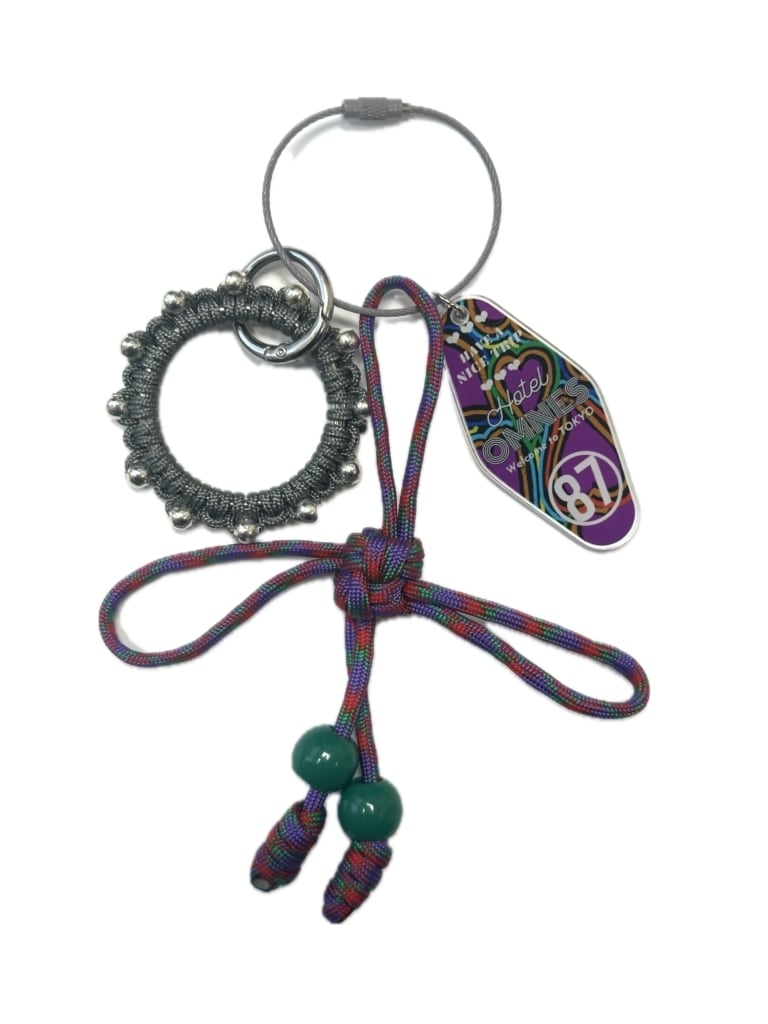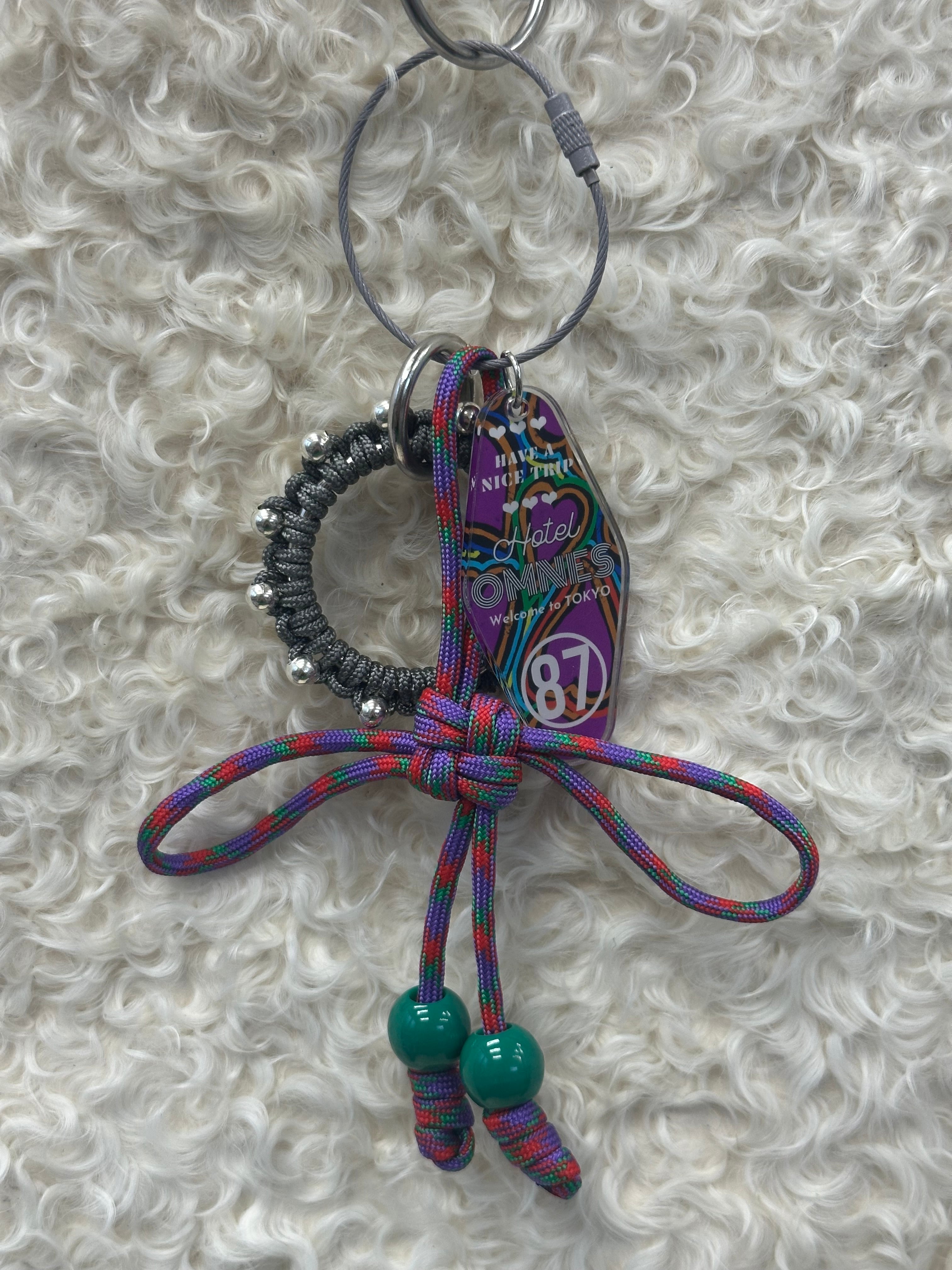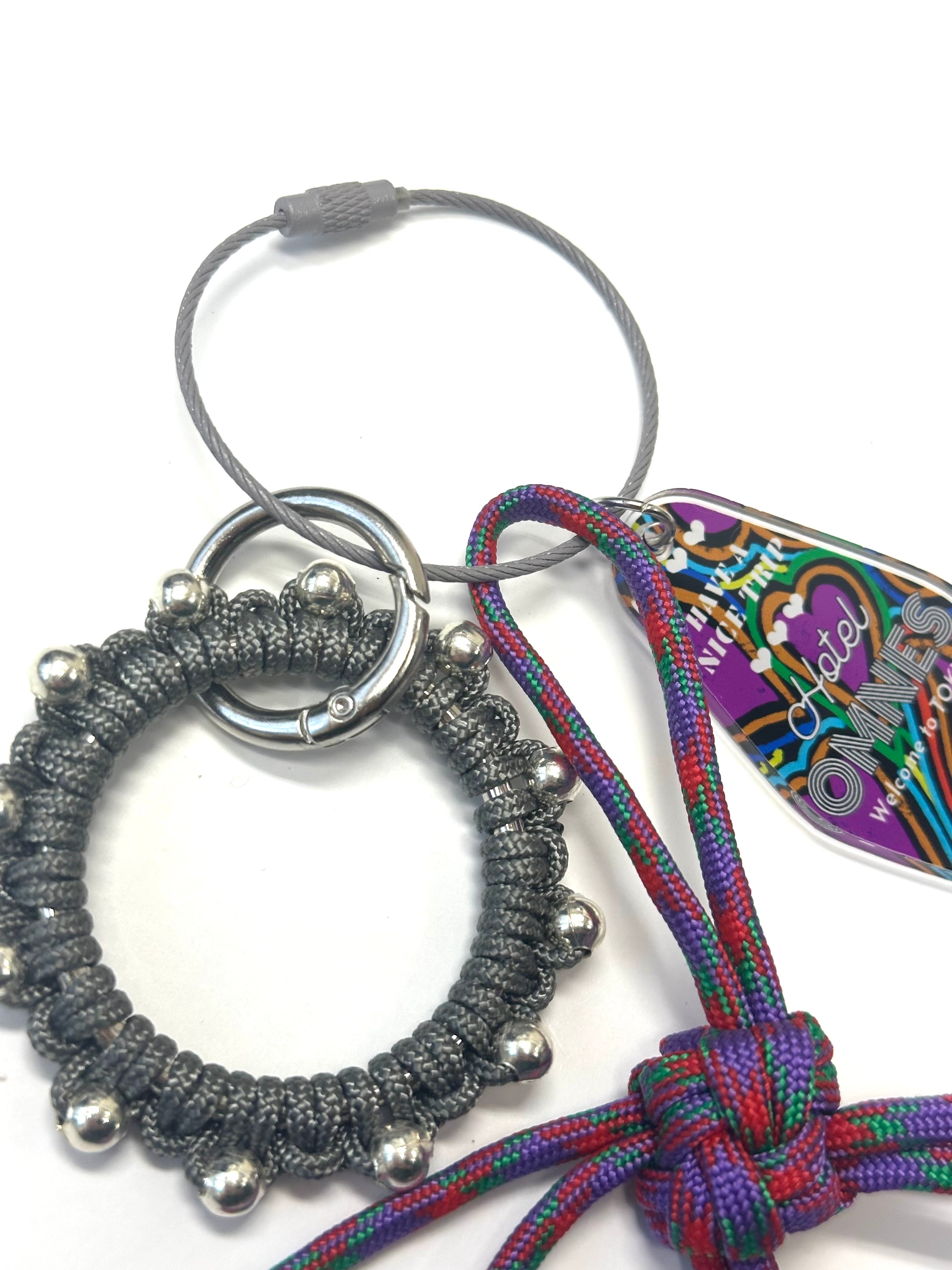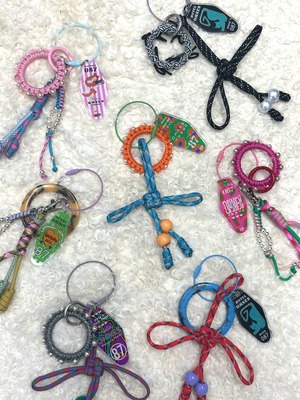 全てオリジナルで制作したアクリルパーツやパラコードのチャーム、レザーパーツを組み合わせたキーリング。