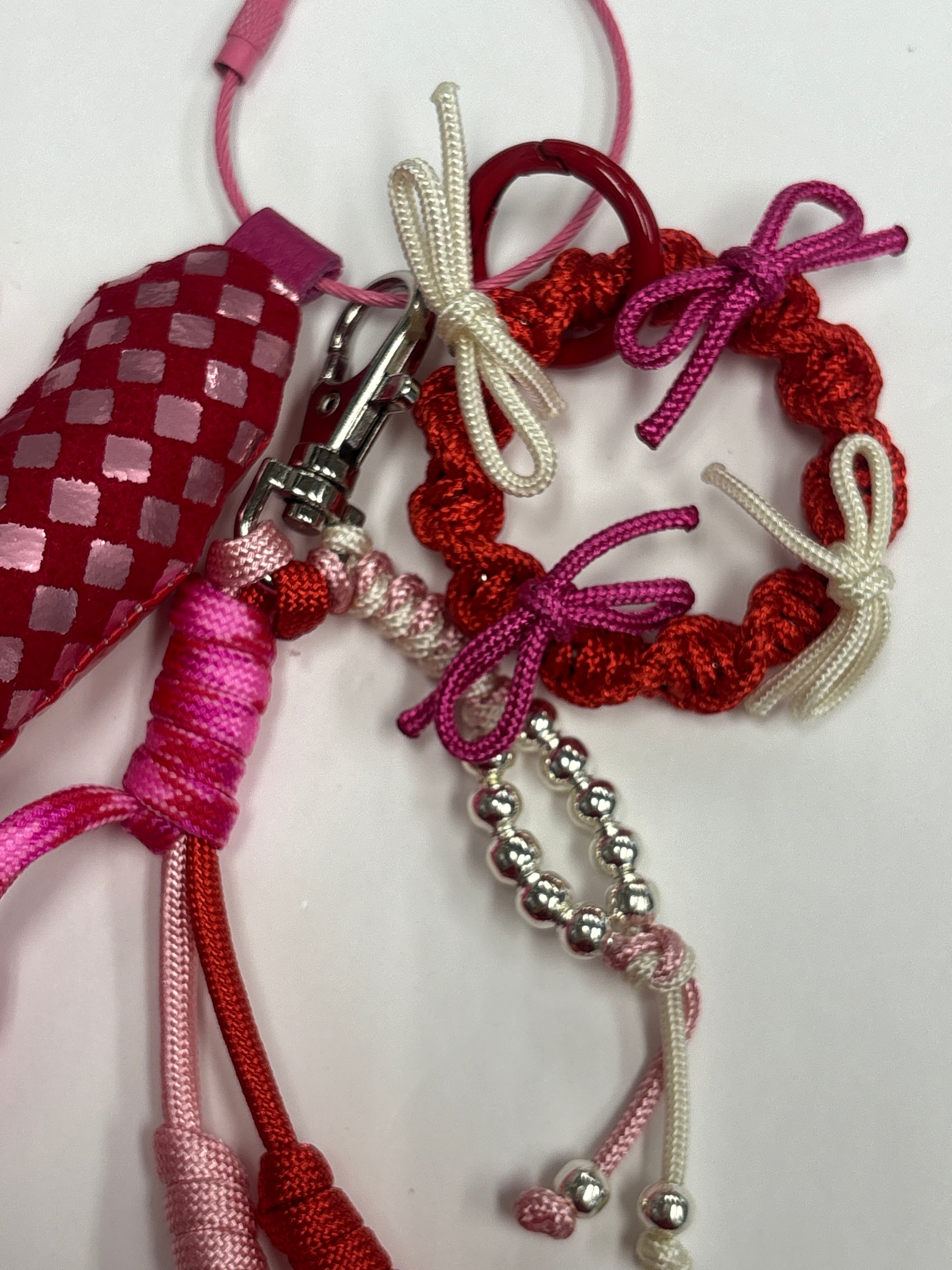 全てオリジナルで制作したアクリルパーツやパラコードのチャーム、レザーパーツを組み合わせたキーリング。