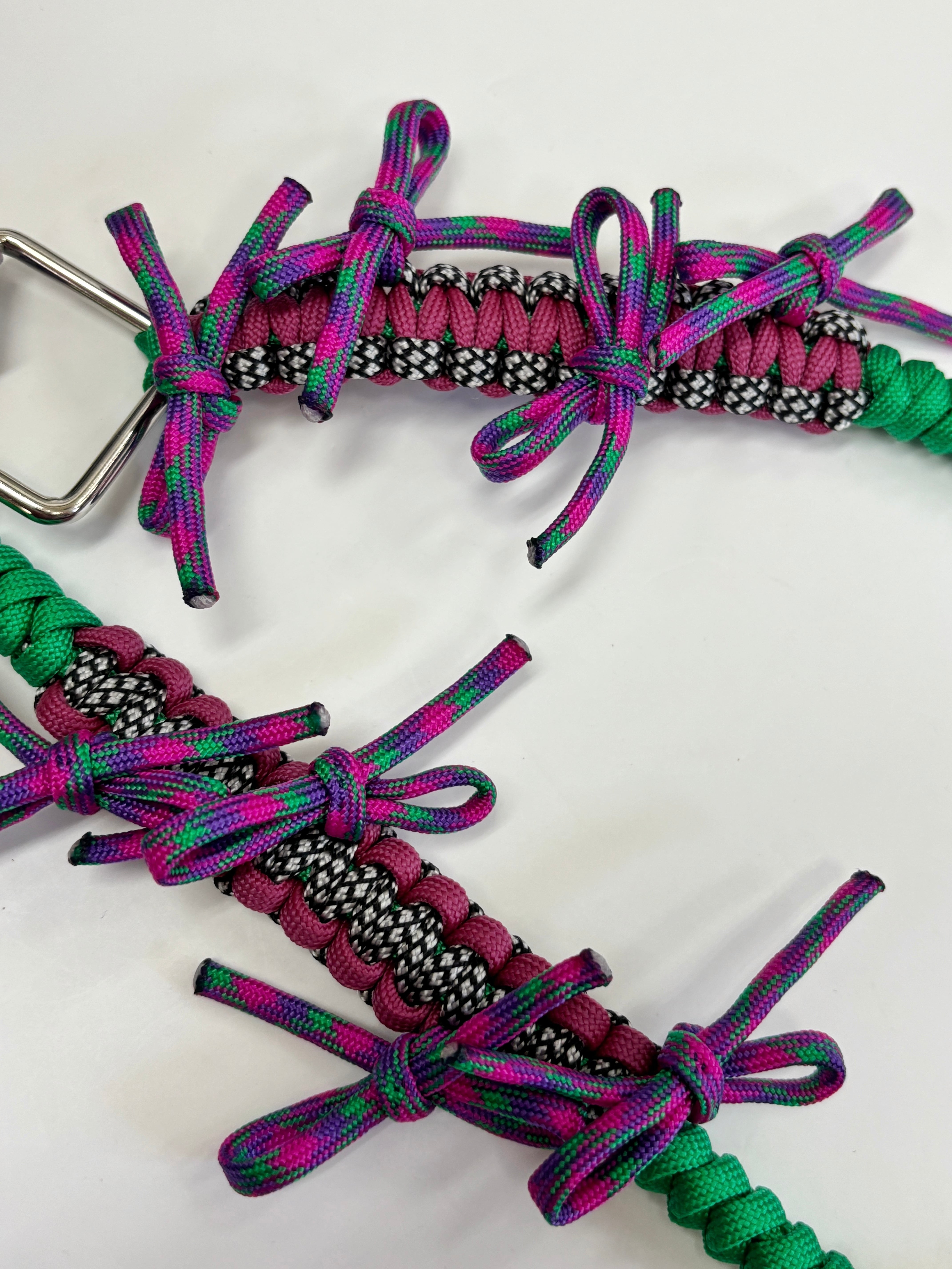 編み上げたパラコードとバッグを作る際のカラフルなレザーの切れ端を使って一点一点ハンドメイドで作られたスペシャルなストラップです。