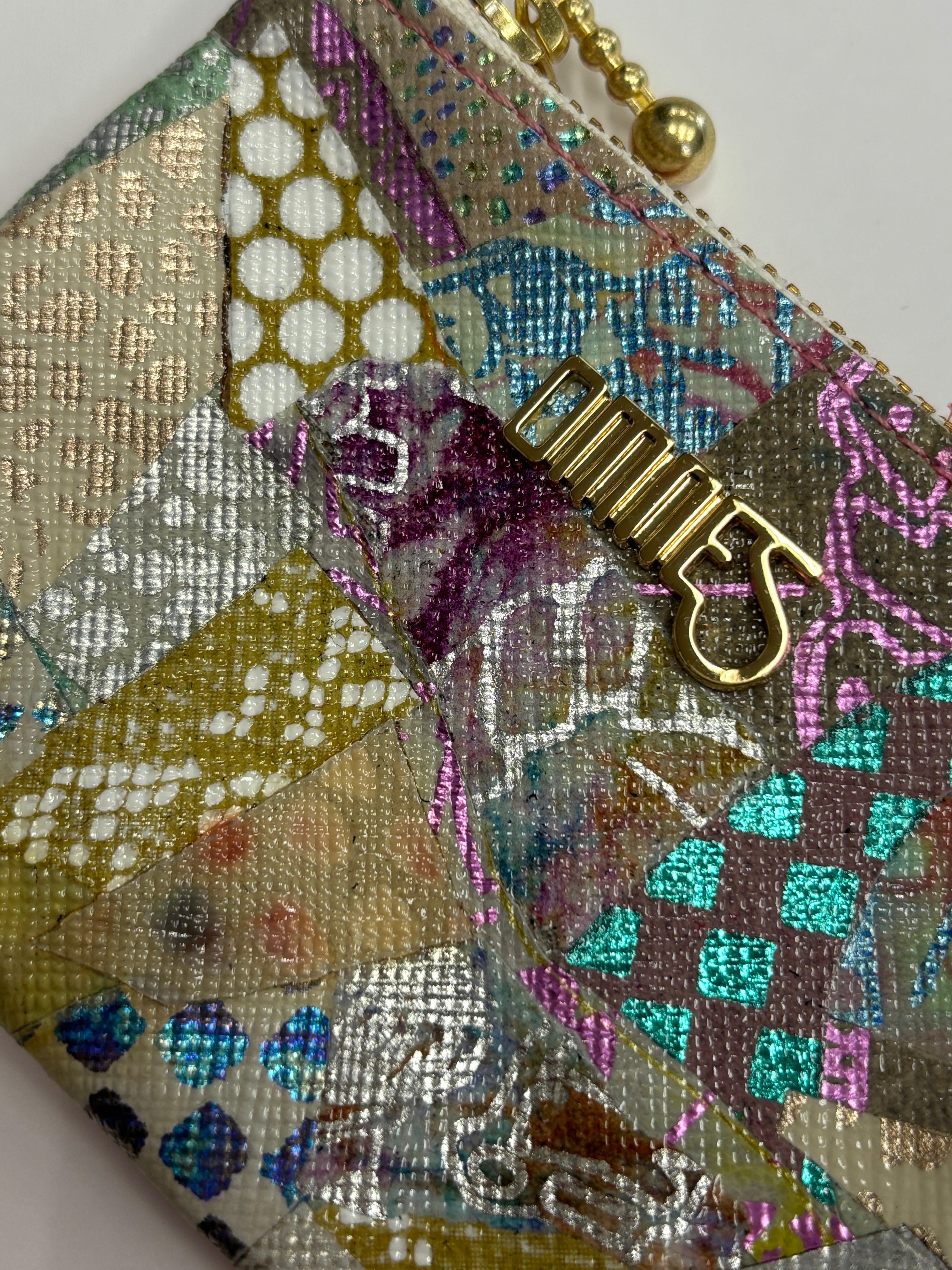 こちらの商品は全て手作業でコラージュした素材です。素材の下地の革が隙間から見えているもの、加工の際に一部革の繊維などが付着したままエナメルフィルム加工がされている箇所がございます。画像でのご確認をお願いいたします。