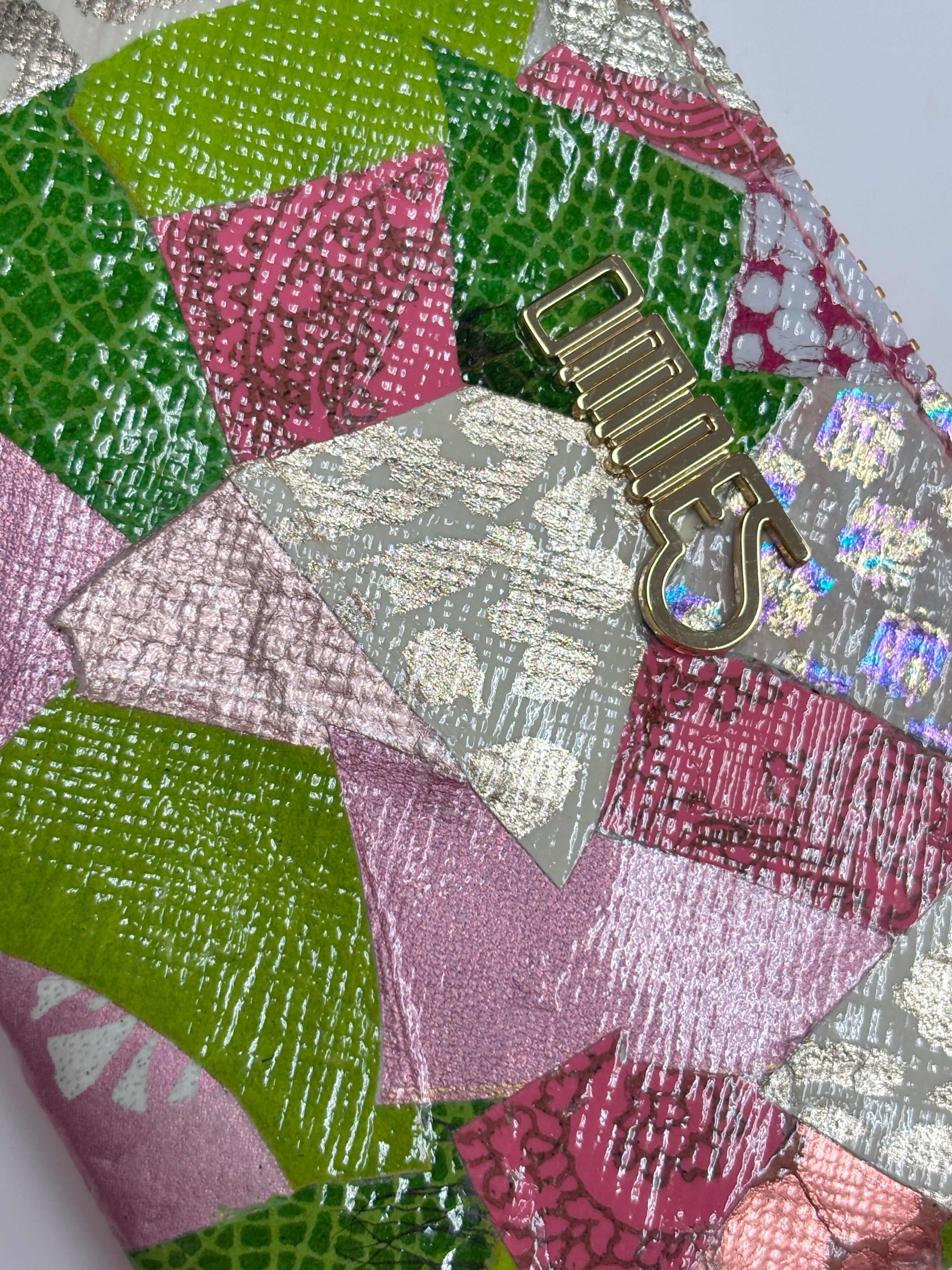 コラージュ加工の上には厚みを揃えるため、一体感を出すためにエナメルフィルム加工が施されております。またその上から様々な型押し加工がされており艶っとした手触りと表情感が楽しめます。