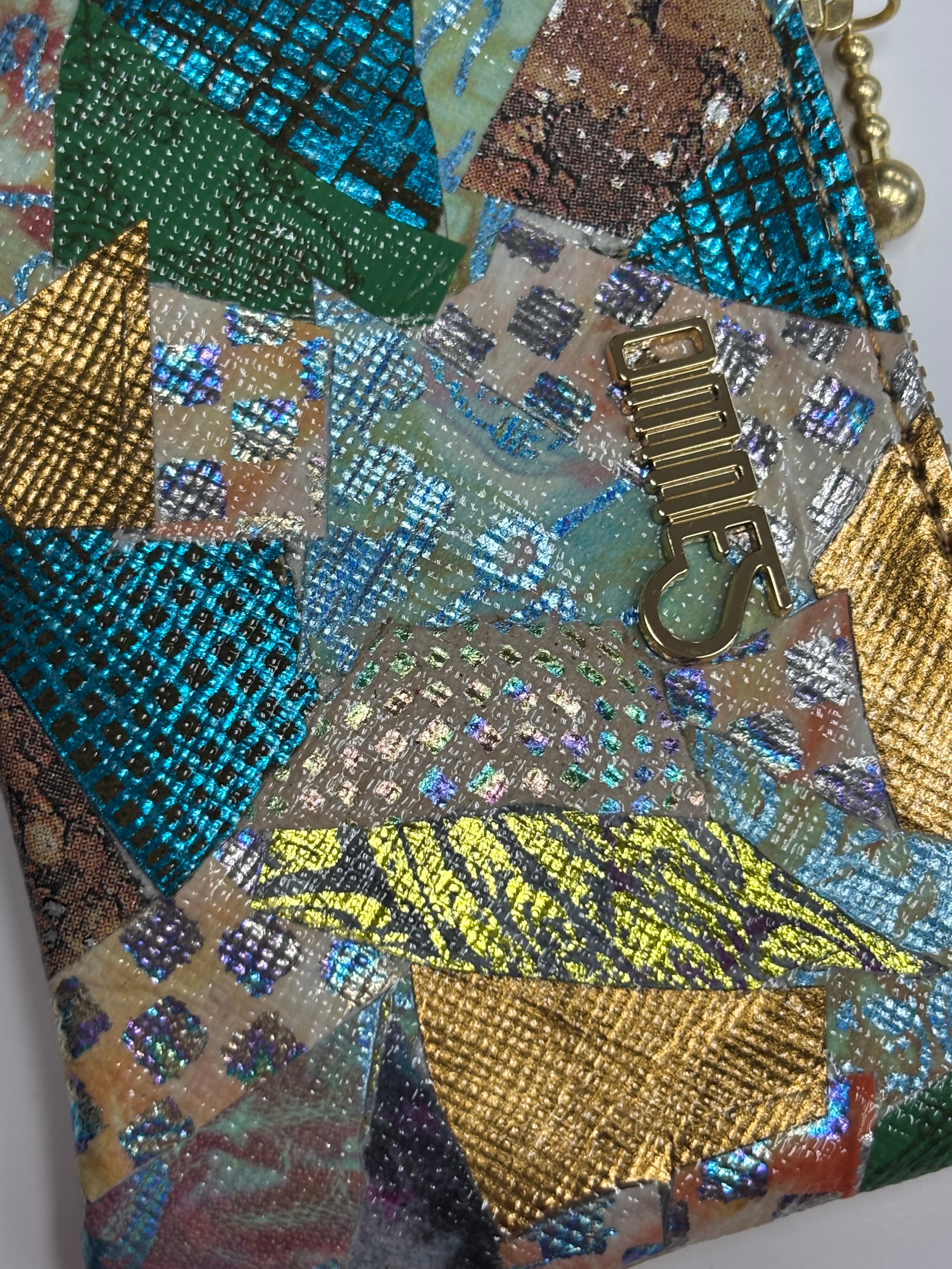 コラージュ加工の上には厚みを揃えるため、一体感を出すためにエナメルフィルム加工が施されております。またその上から様々な型押し加工がされており艶っとした手触りと表情感が楽しめます。