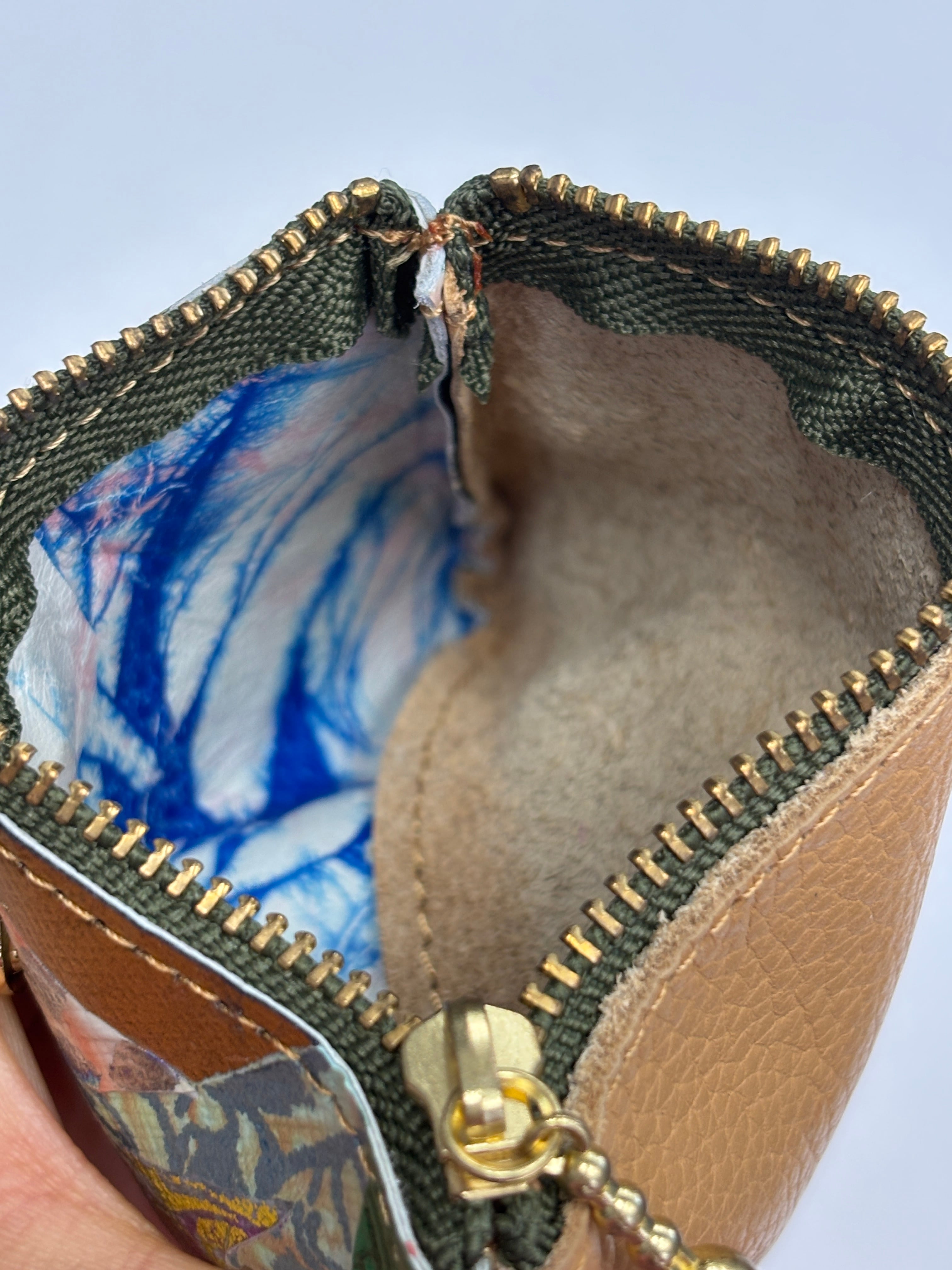 こちらの商品は全て手作業でコラージュした素材です。素材の下地の革が隙間から見えているもの、加工の際に一部革の繊維などが付着したままエナメルフィルム加工がされている箇所がございます。画像でのご確認をお願いいたします。
