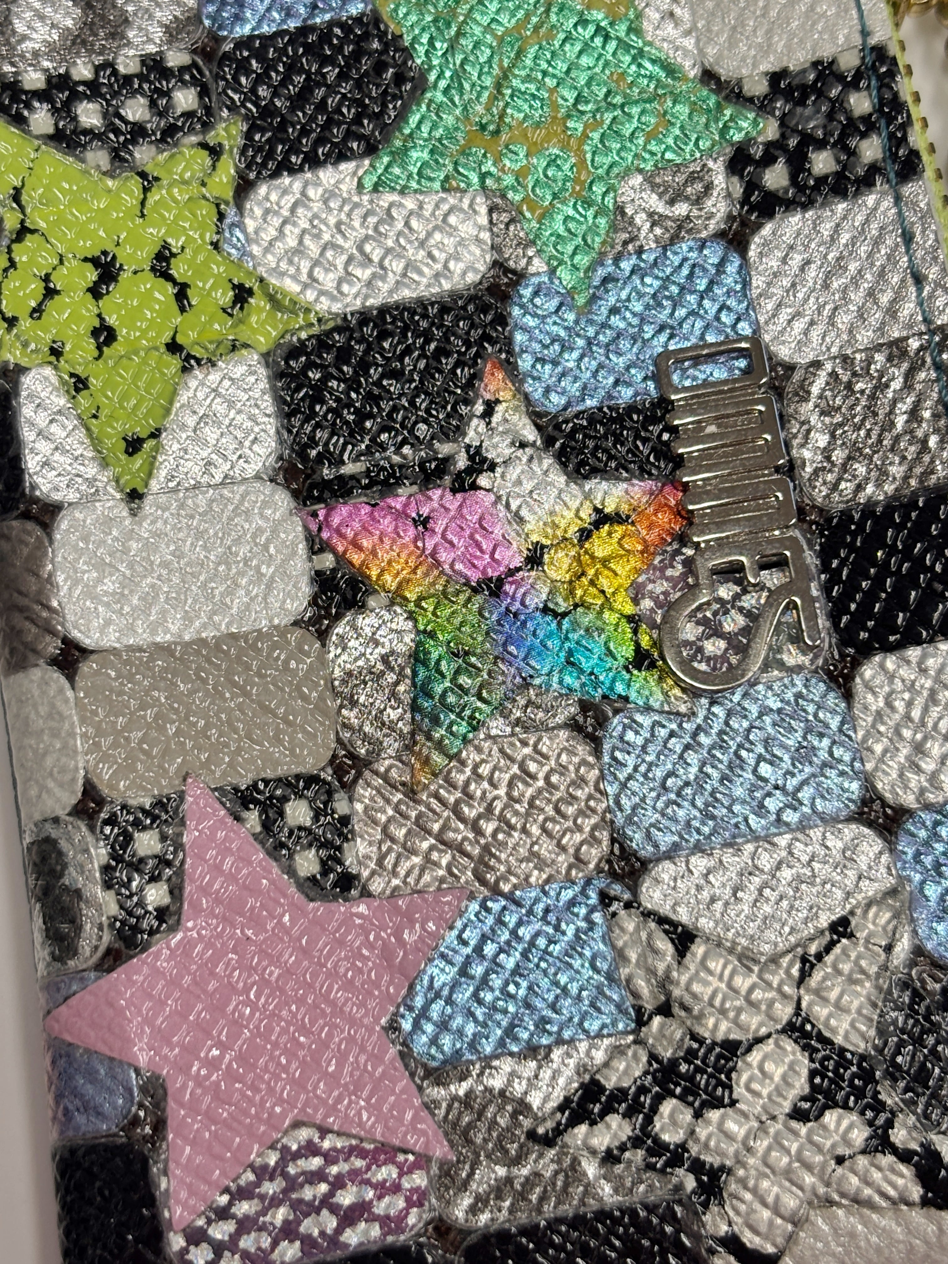こちらの商品は全て手作業でコラージュした素材です。素材の下地の革が隙間から見えているもの、加工の際に一部革の繊維などが付着したままエナメルフィルム加工がされている箇所がございます。画像でのご確認をお願いいたします。