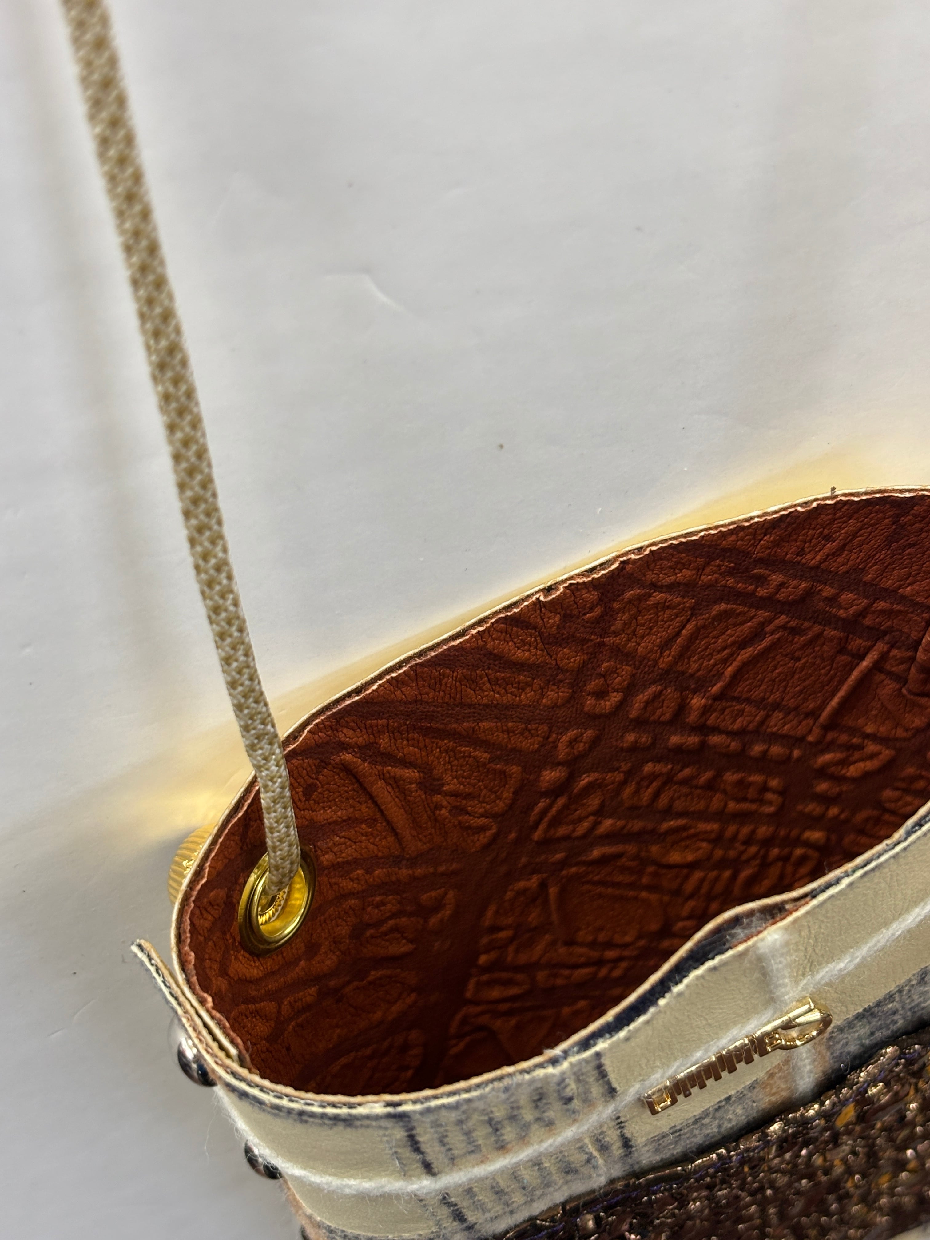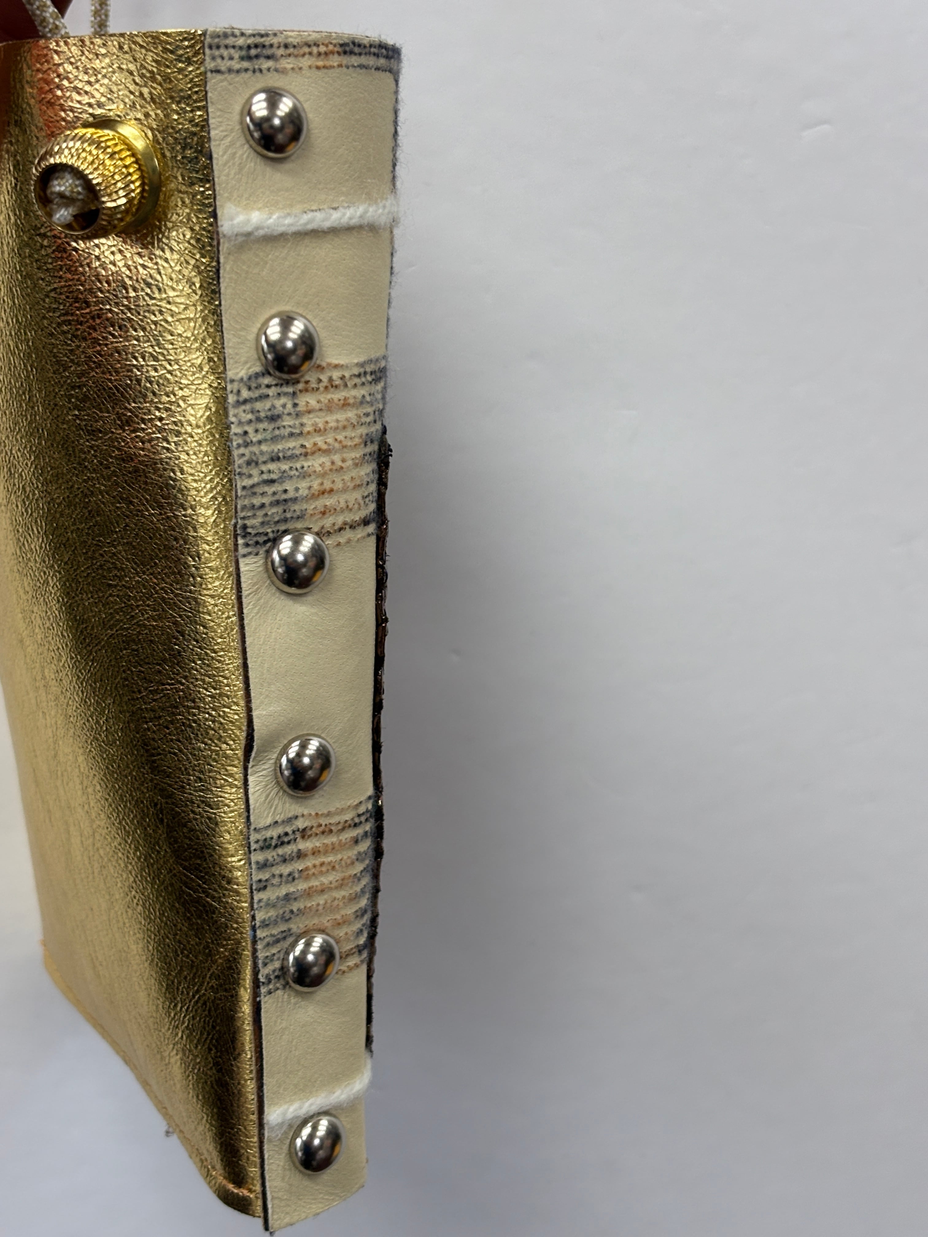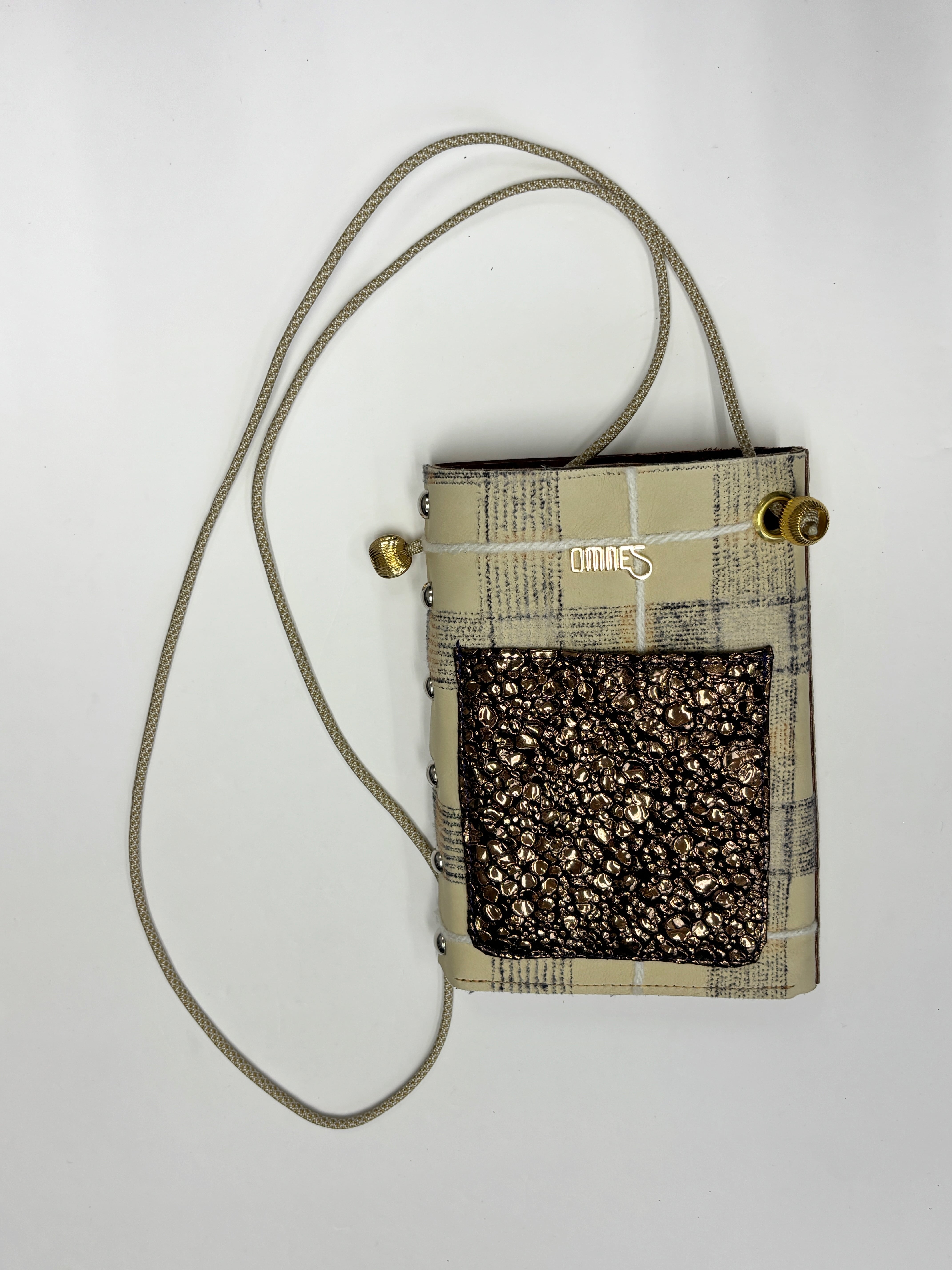 一点ものシリーズの中でも少しコシのあるしっかりした革をベースに、切りっぱなしとまんまるカシメ、目を引くポケットがポイントのコンパクトなショルダーバッグが出来ました!