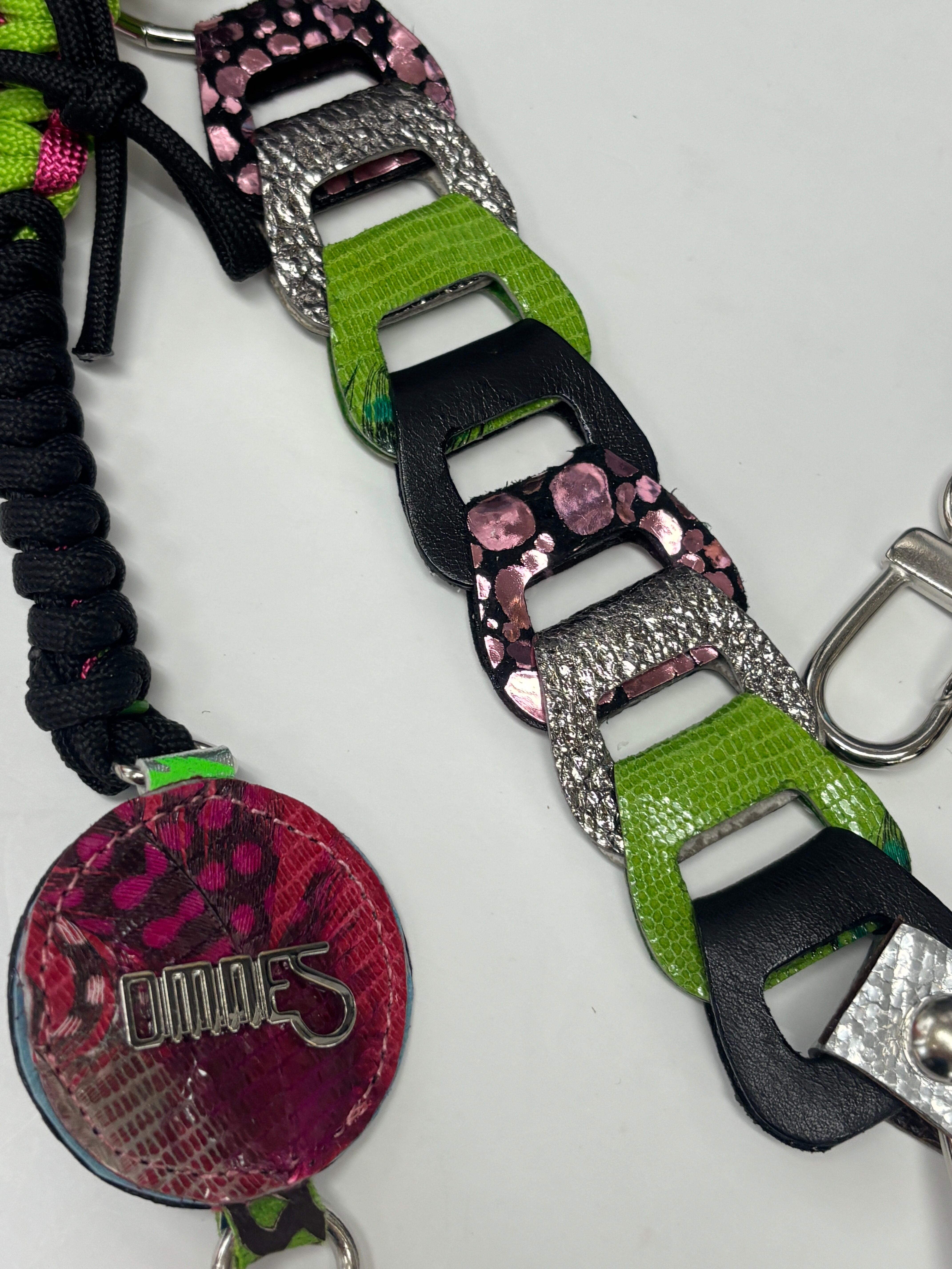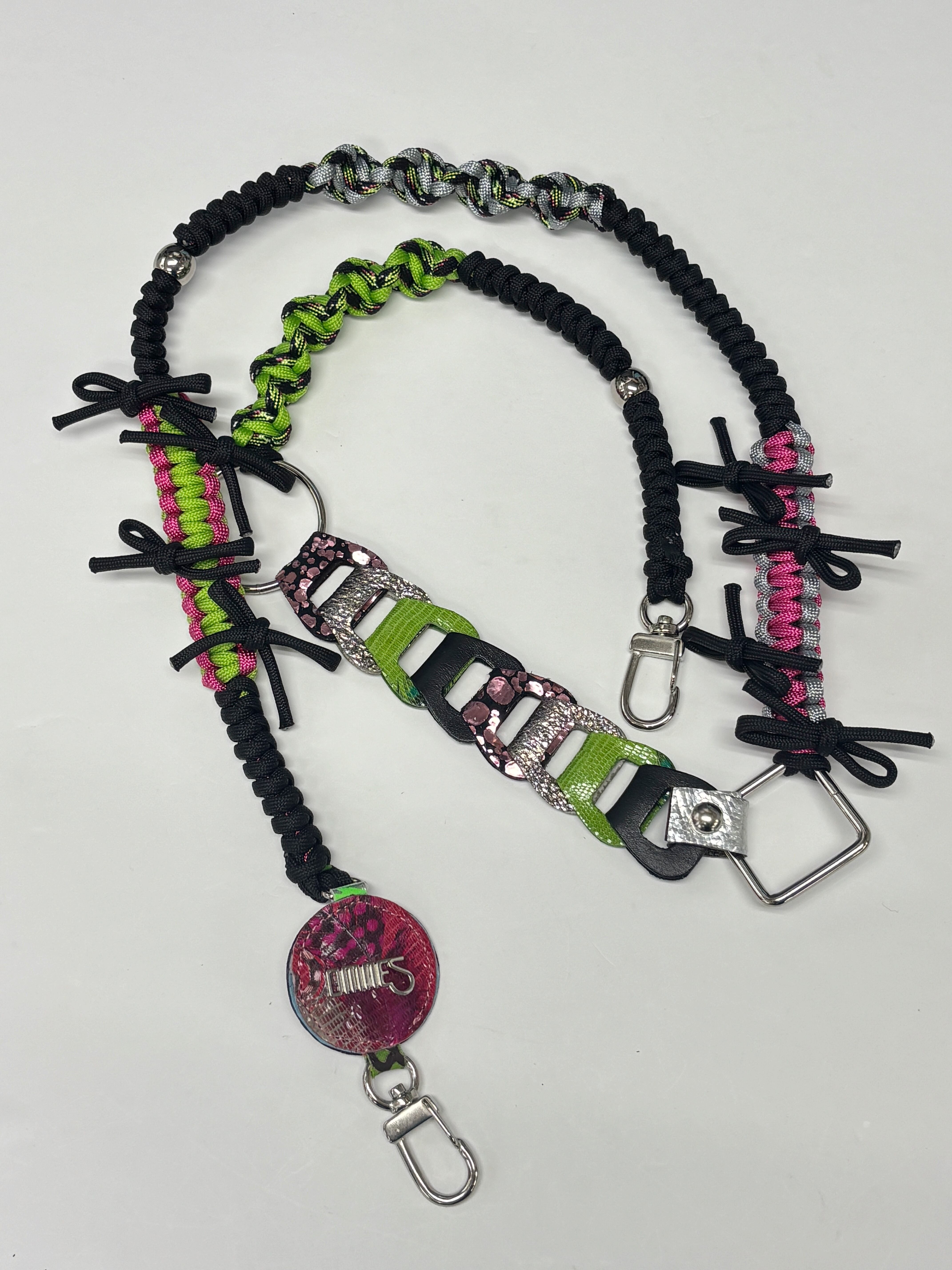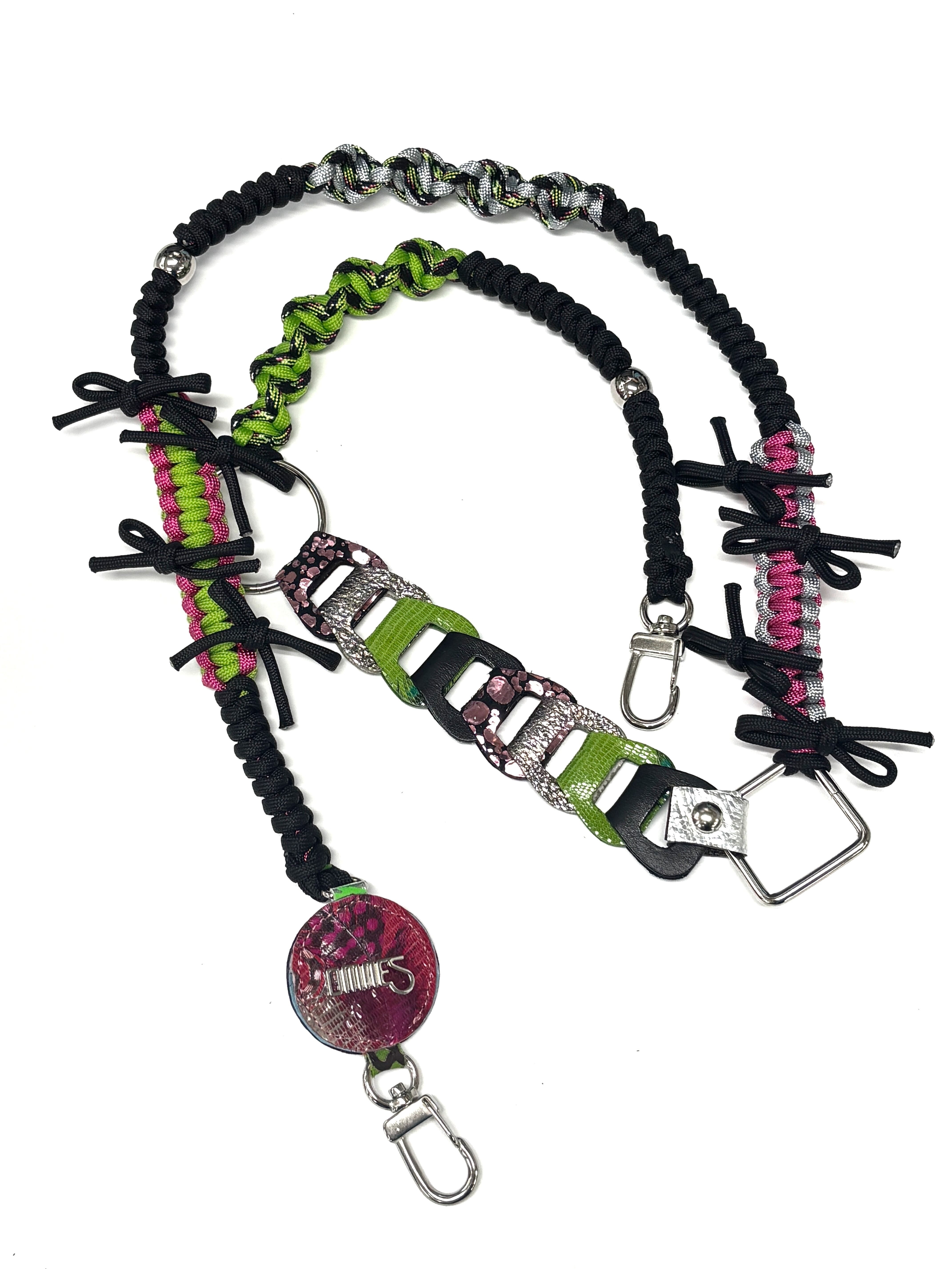 編み上げたパラコードとバッグを作る際のカラフルなレザーの切れ端を使って一点一点ハンドメイドで作られたスペシャルなストラップです。