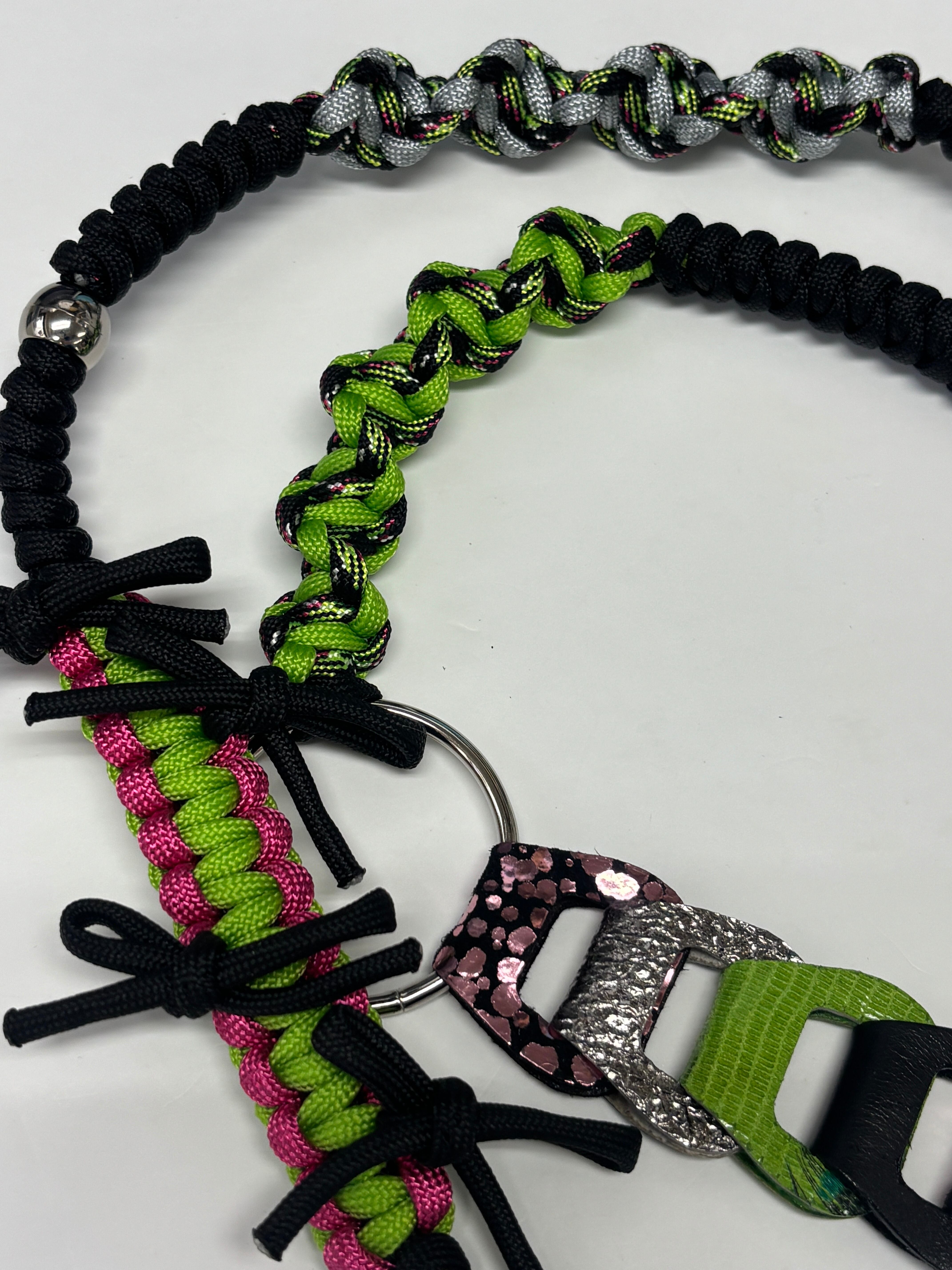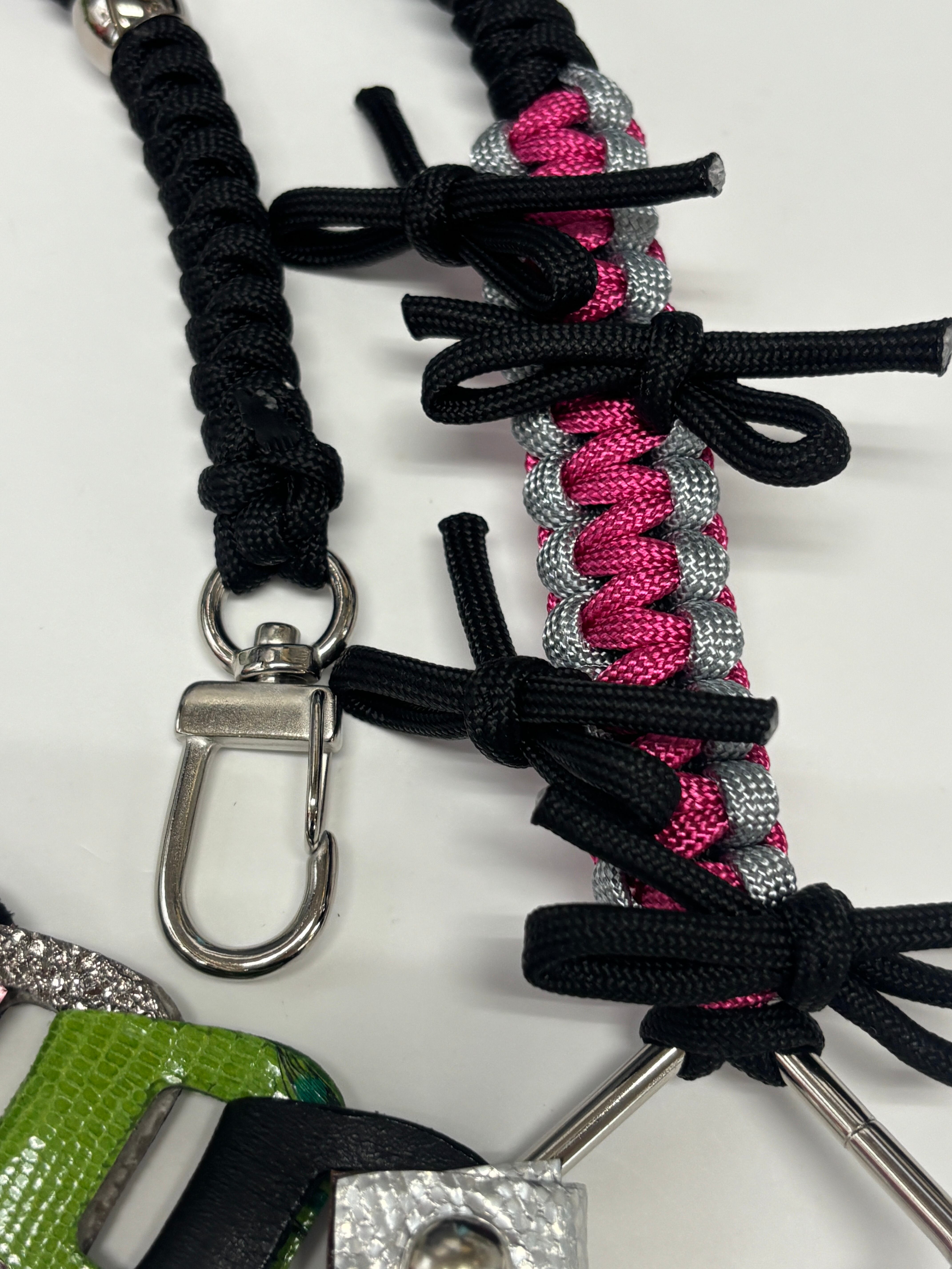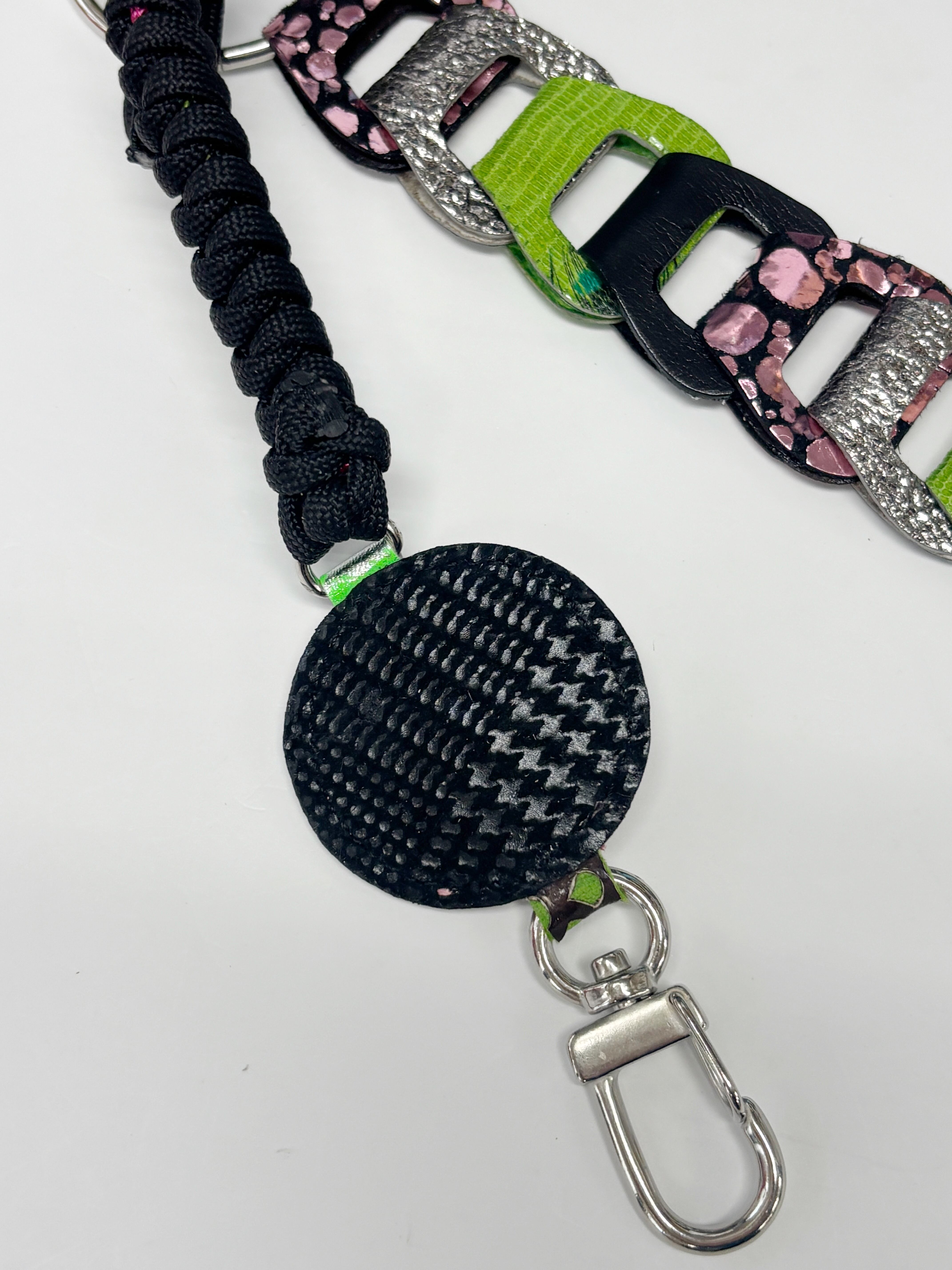 編み上げたパラコードとバッグを作る際のカラフルなレザーの切れ端を使って一点一点ハンドメイドで作られたスペシャルなストラップです。