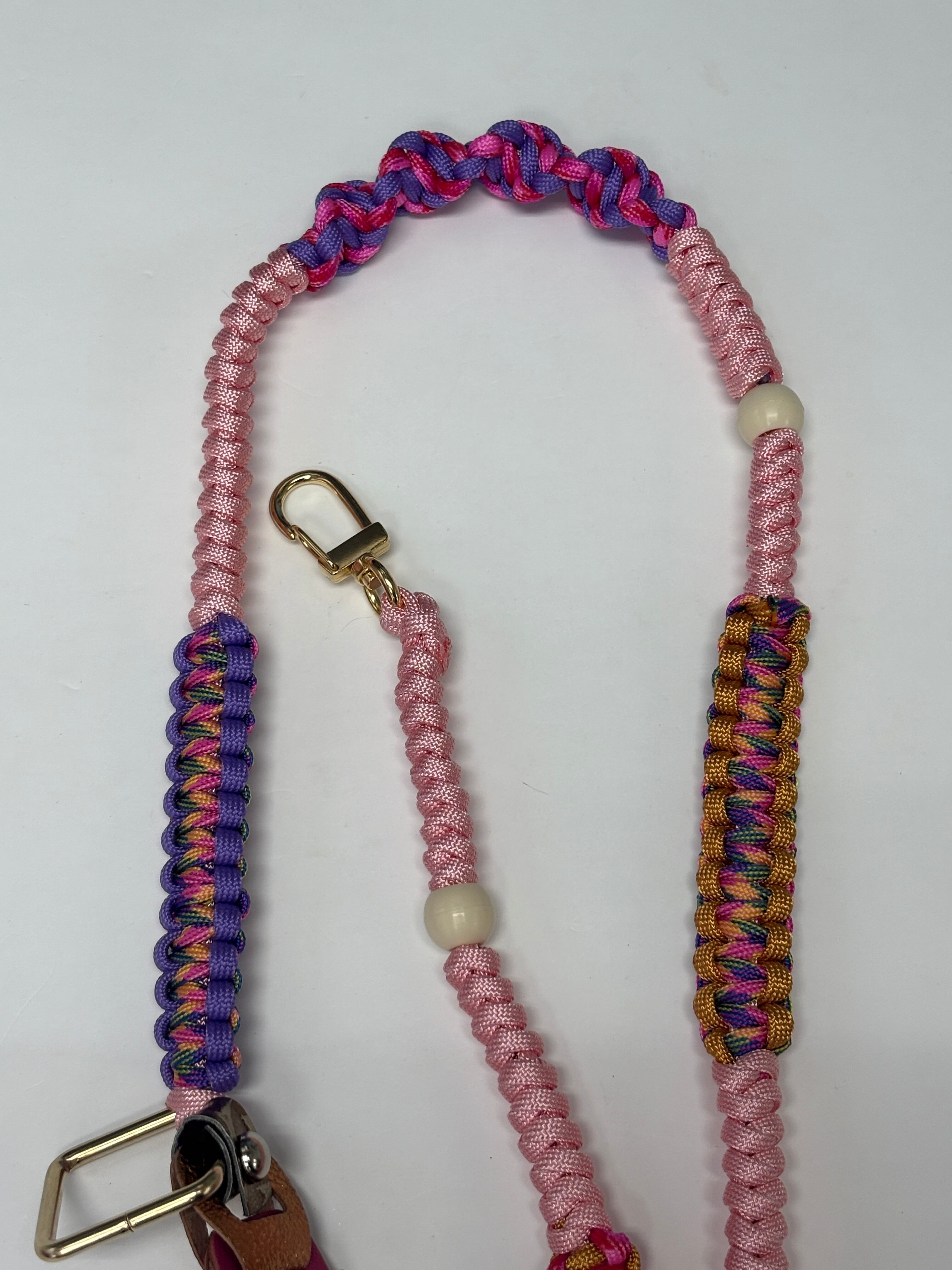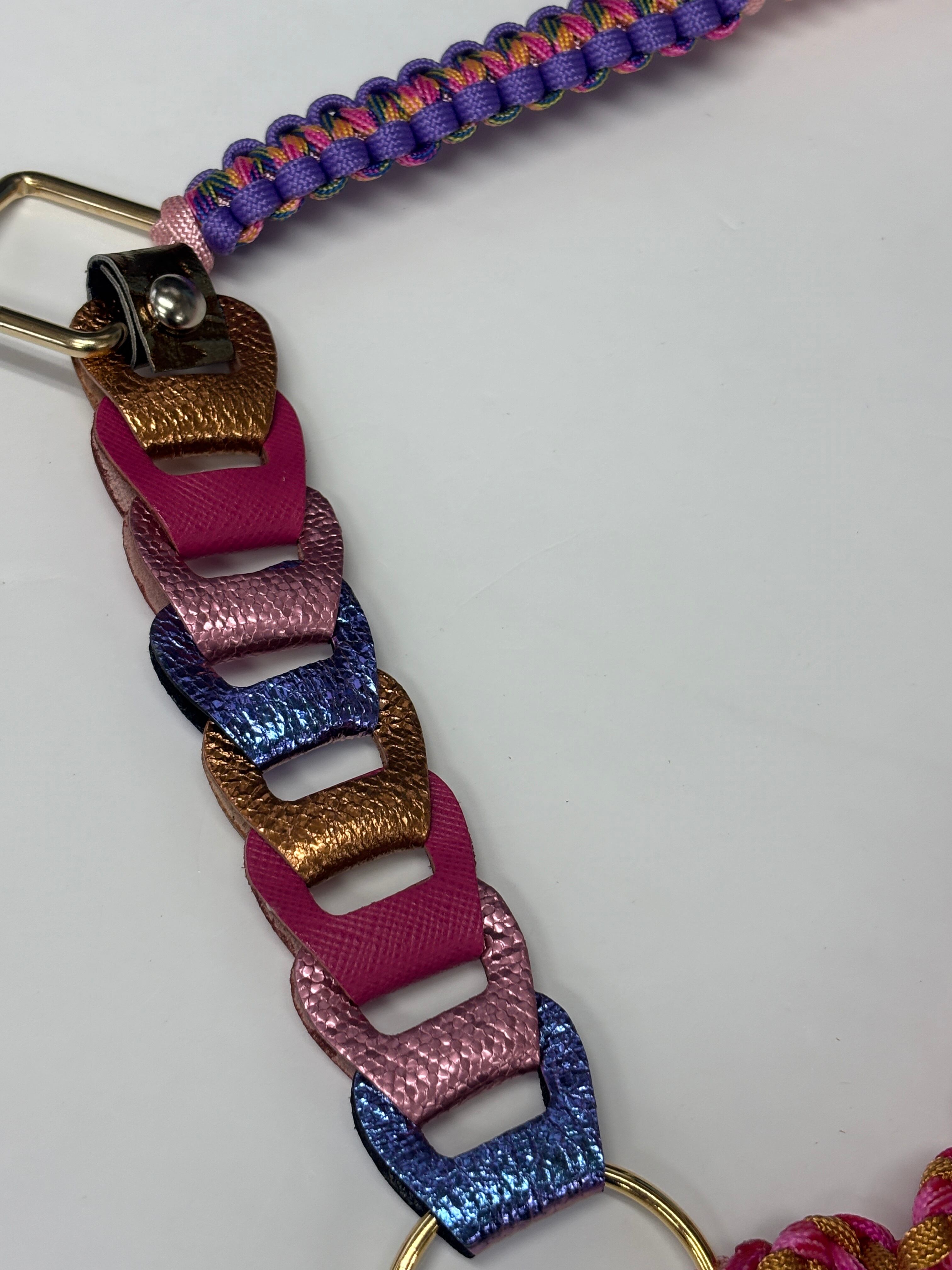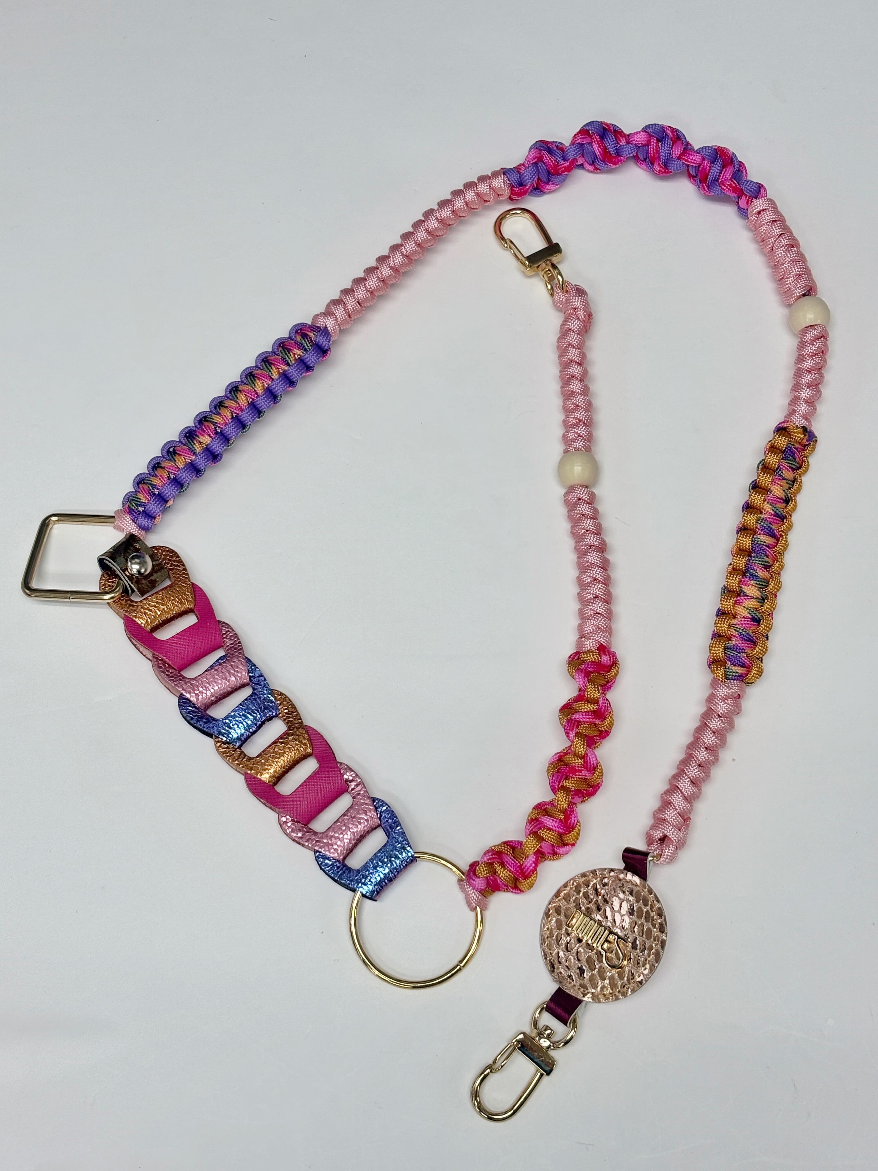 編み上げたパラコードとバッグを作る際のカラフルなレザーの切れ端を使って一点一点ハンドメイドで作られたスペシャルなストラップです。