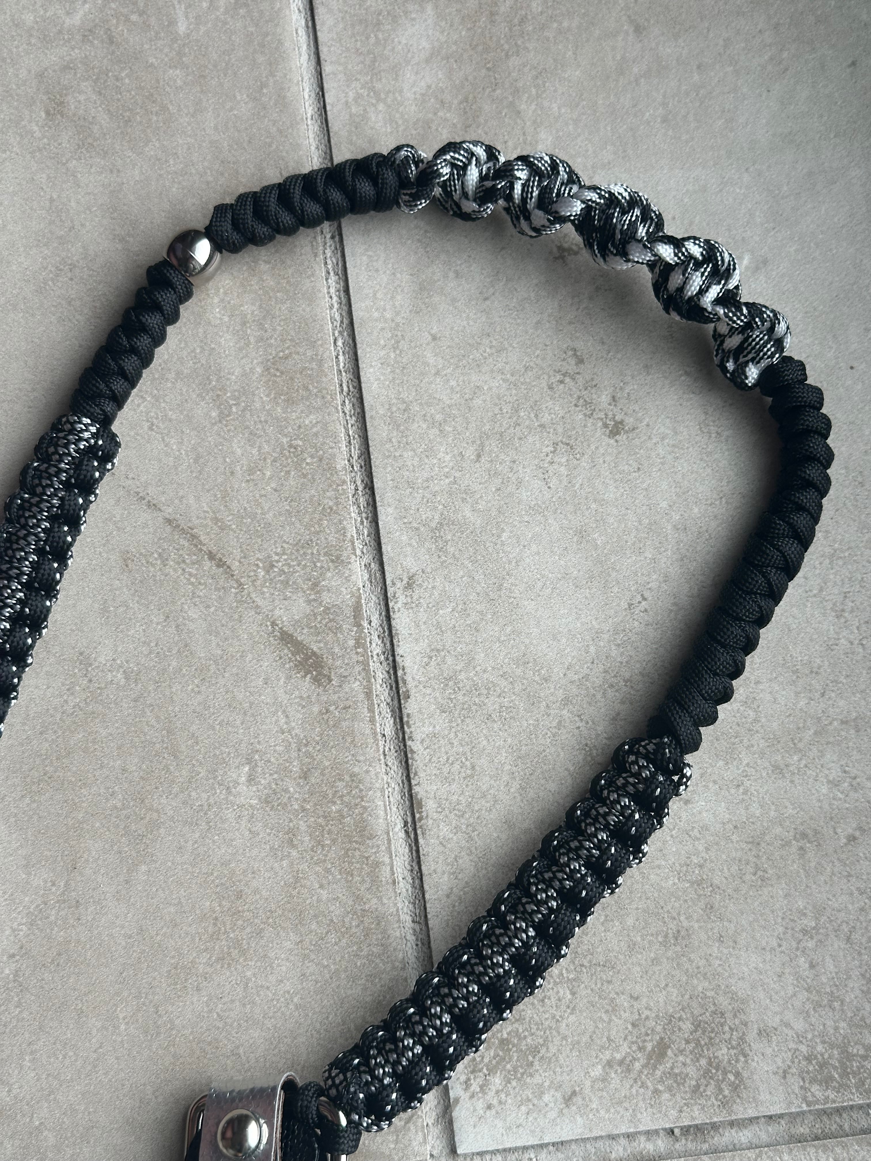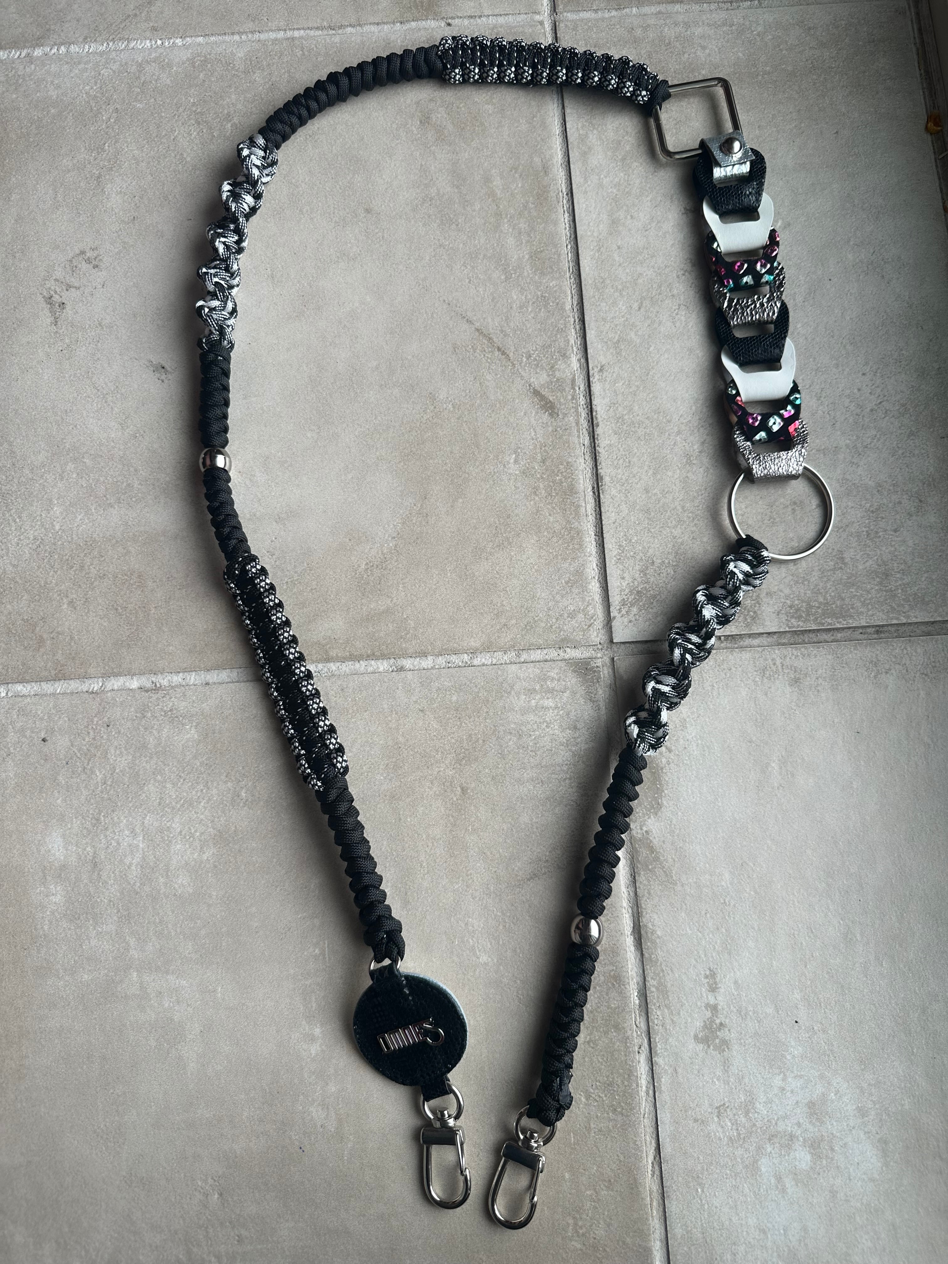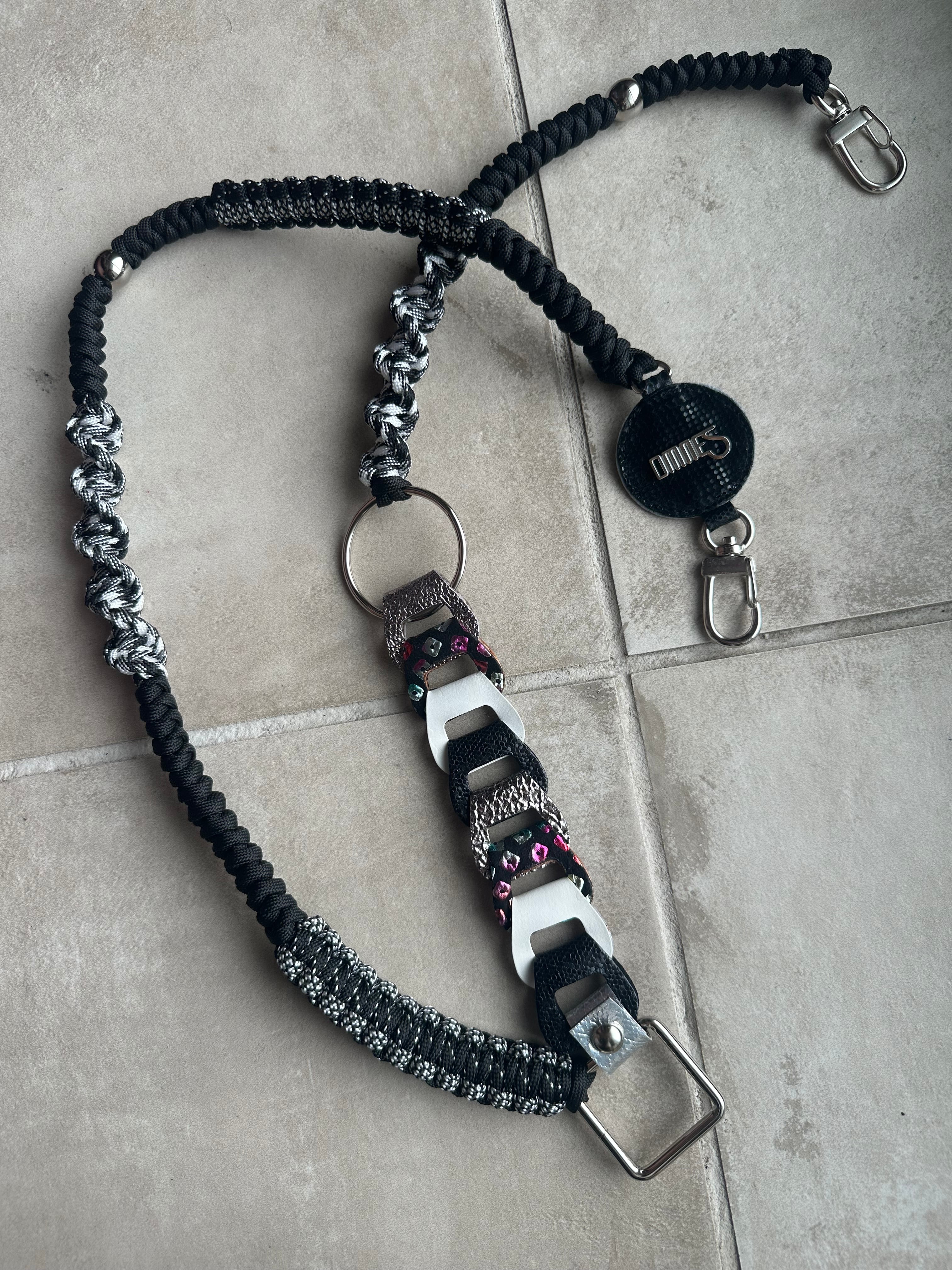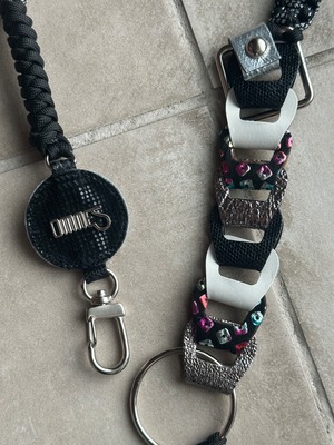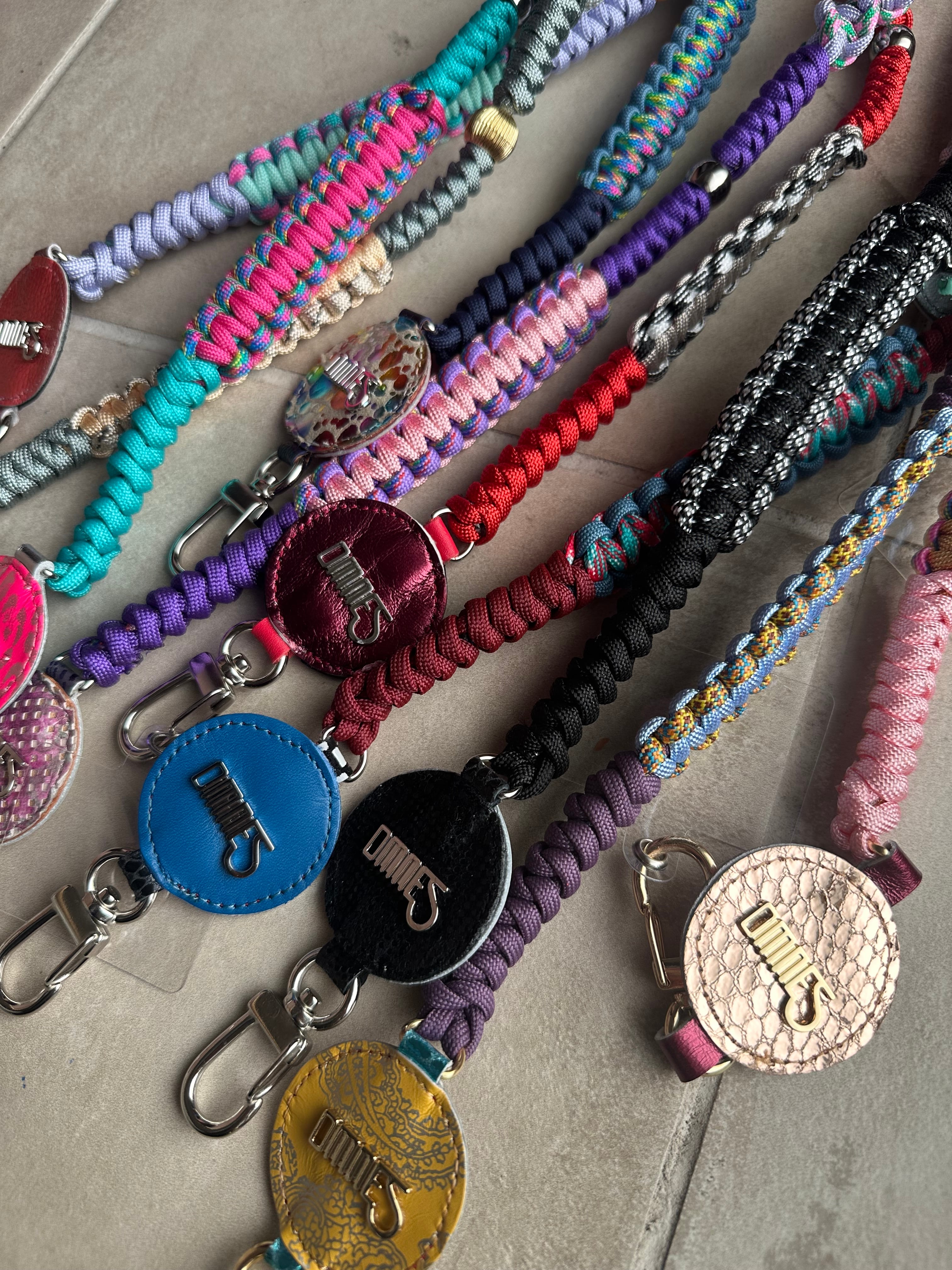 編み上げたパラコードとバッグを作る際のカラフルなレザーの切れ端を使って一点一点ハンドメイドで作られたスペシャルなストラップです。