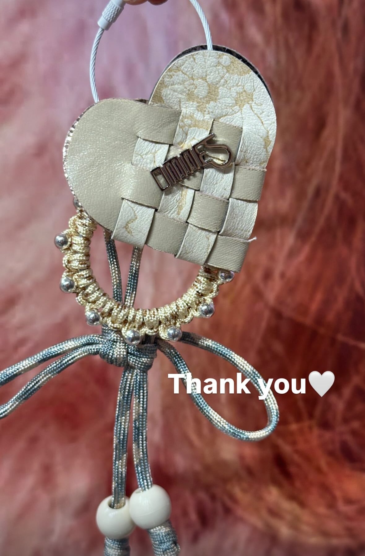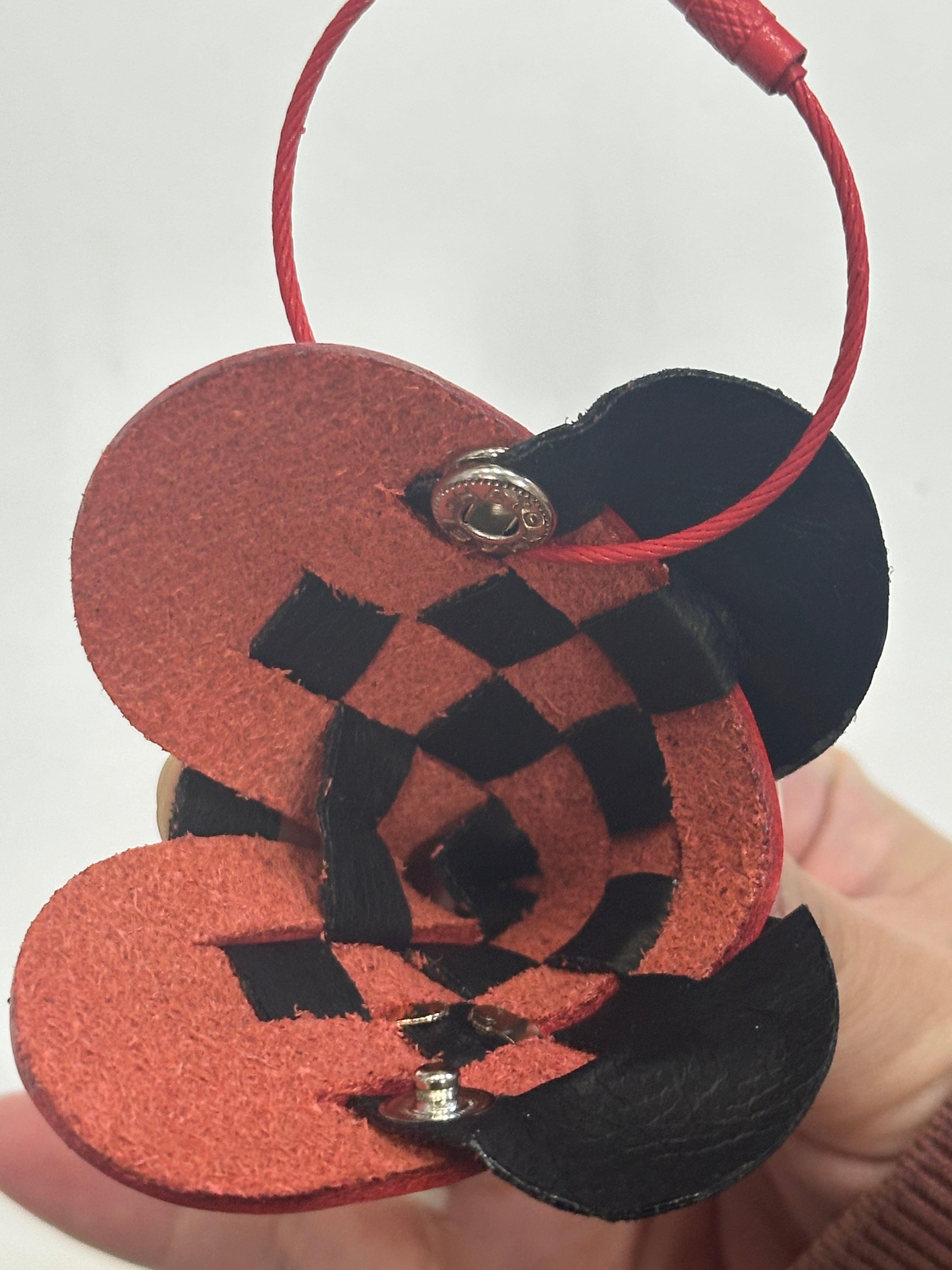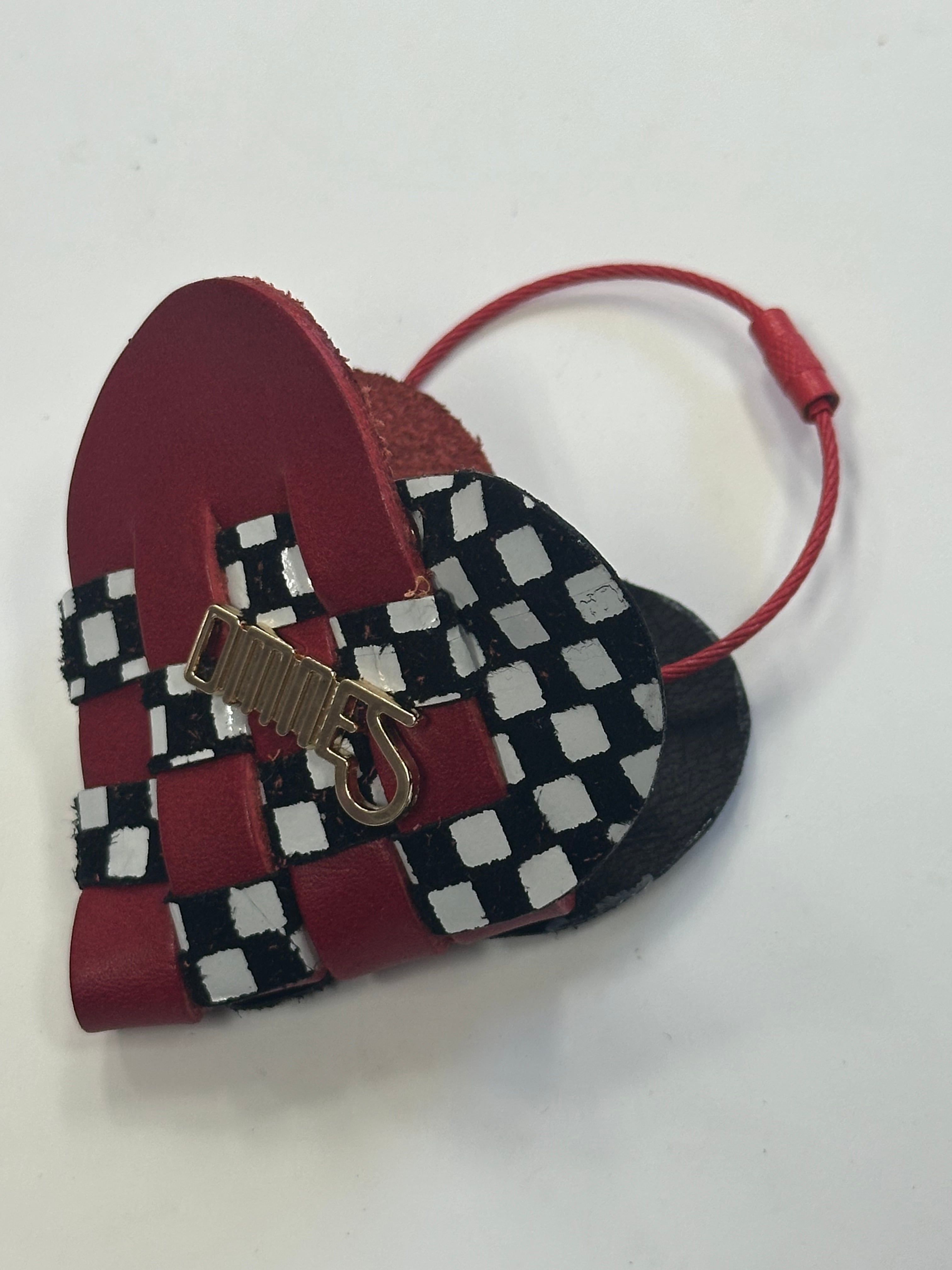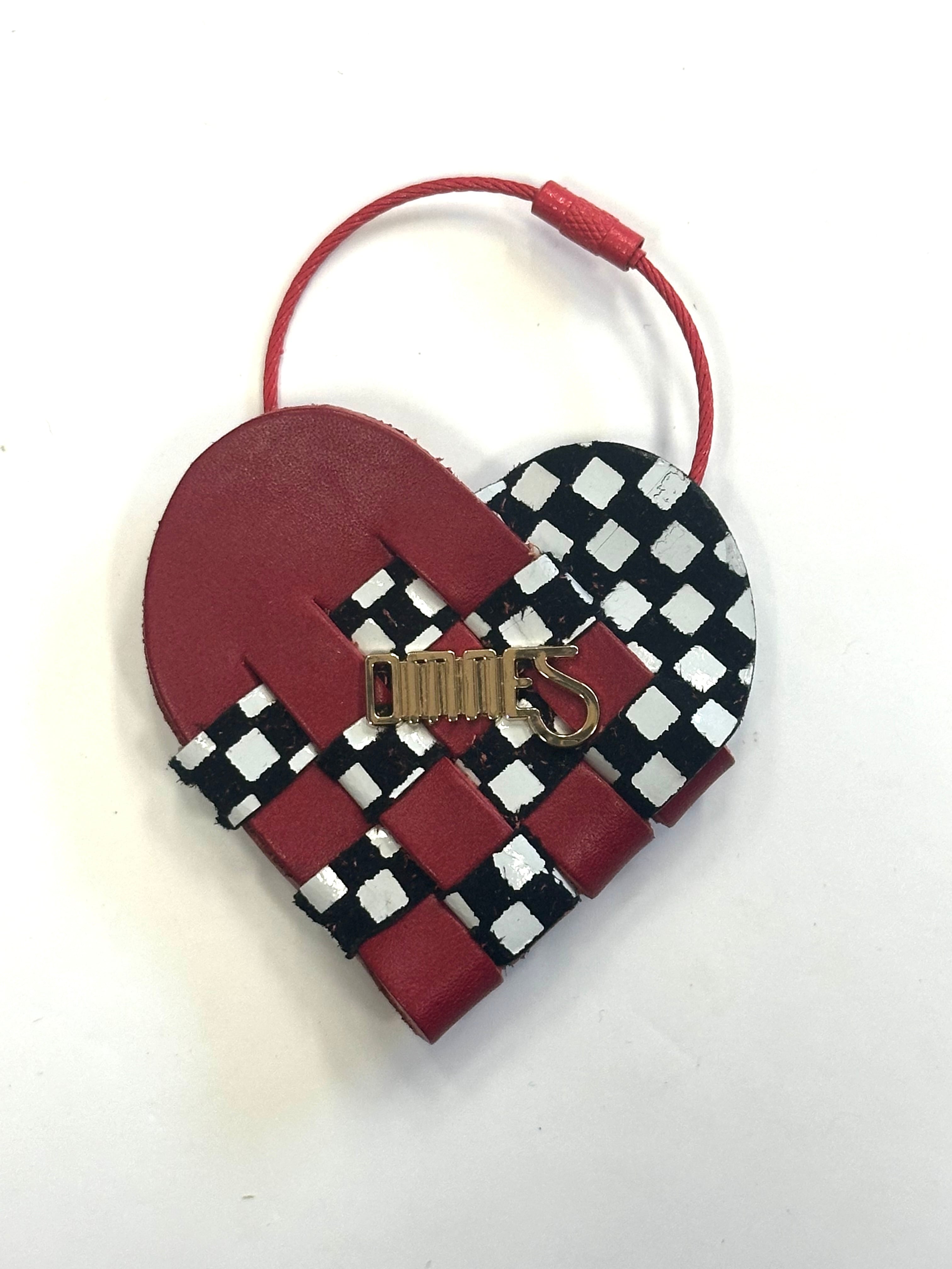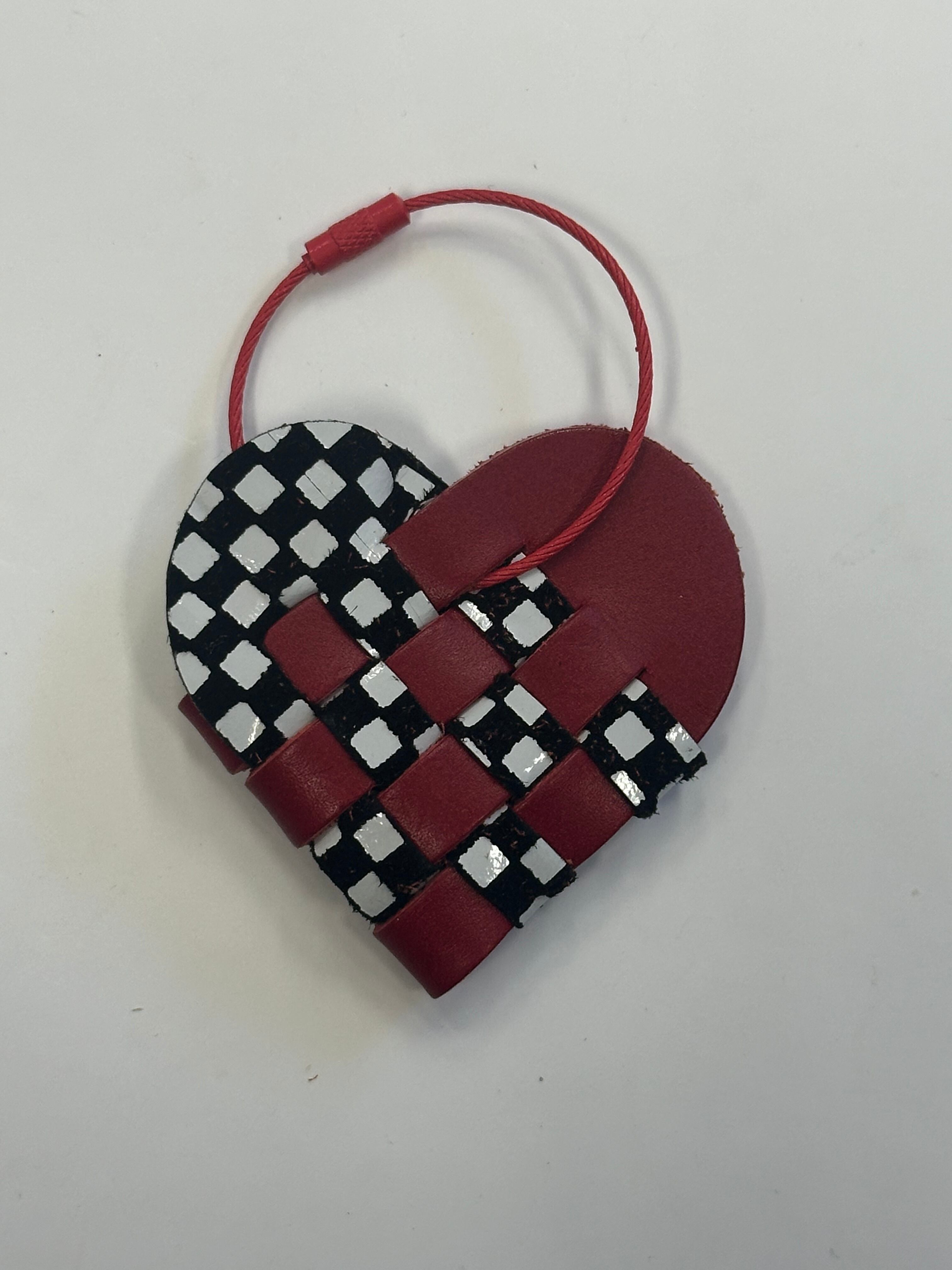 2枚の革を織り合わせて作られた小さなハートのキーリング。