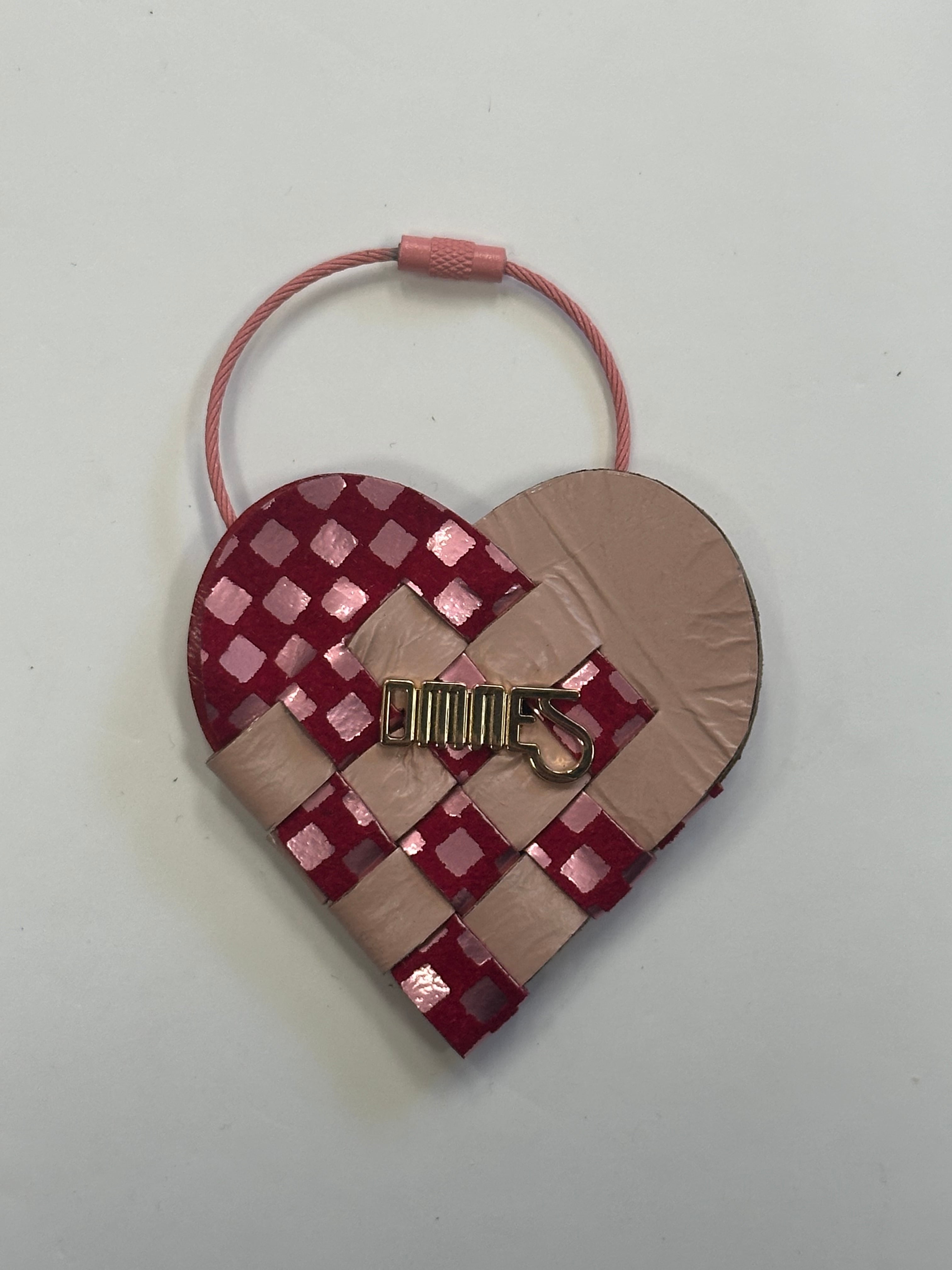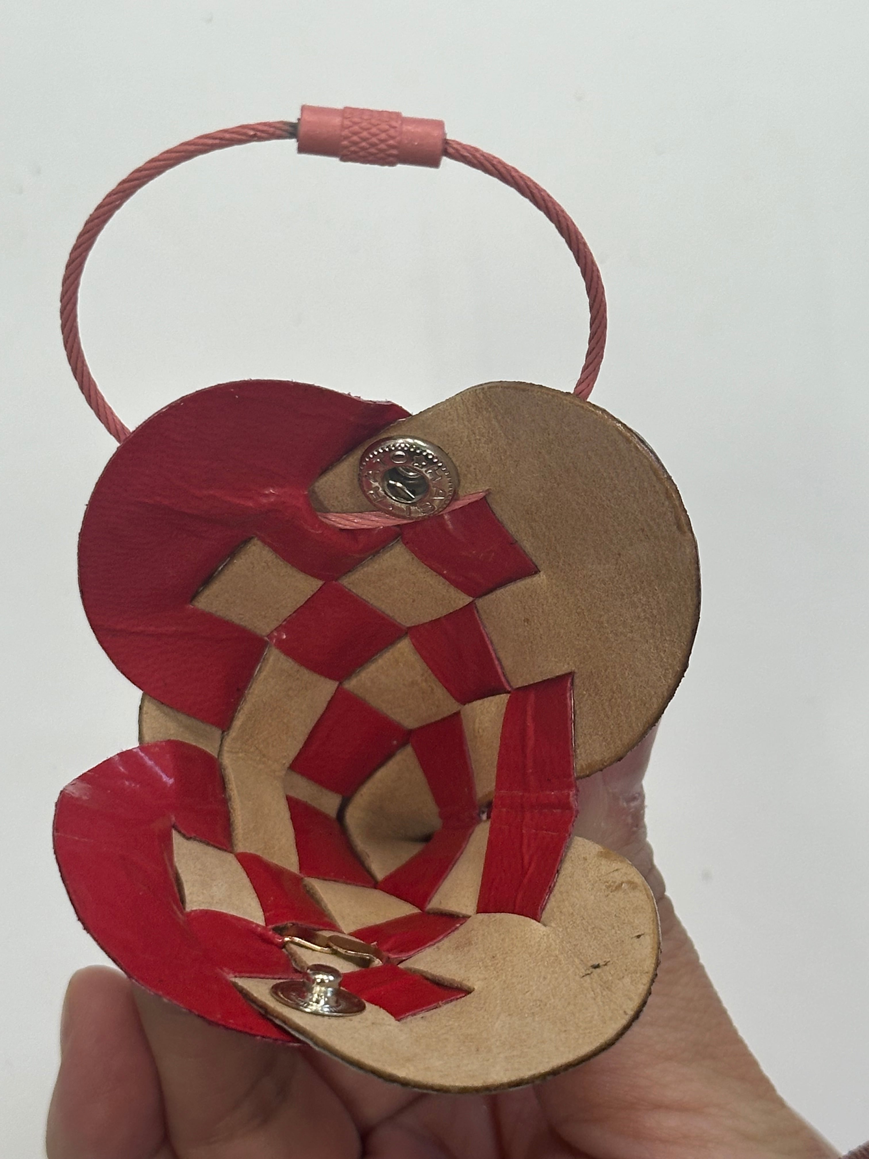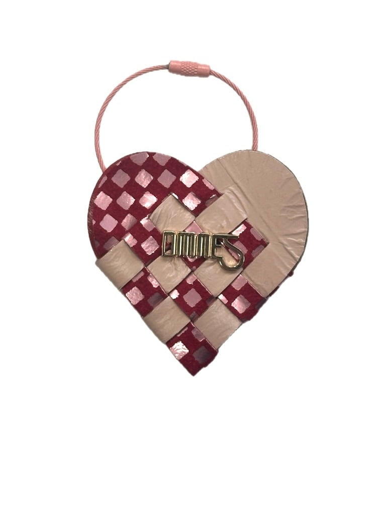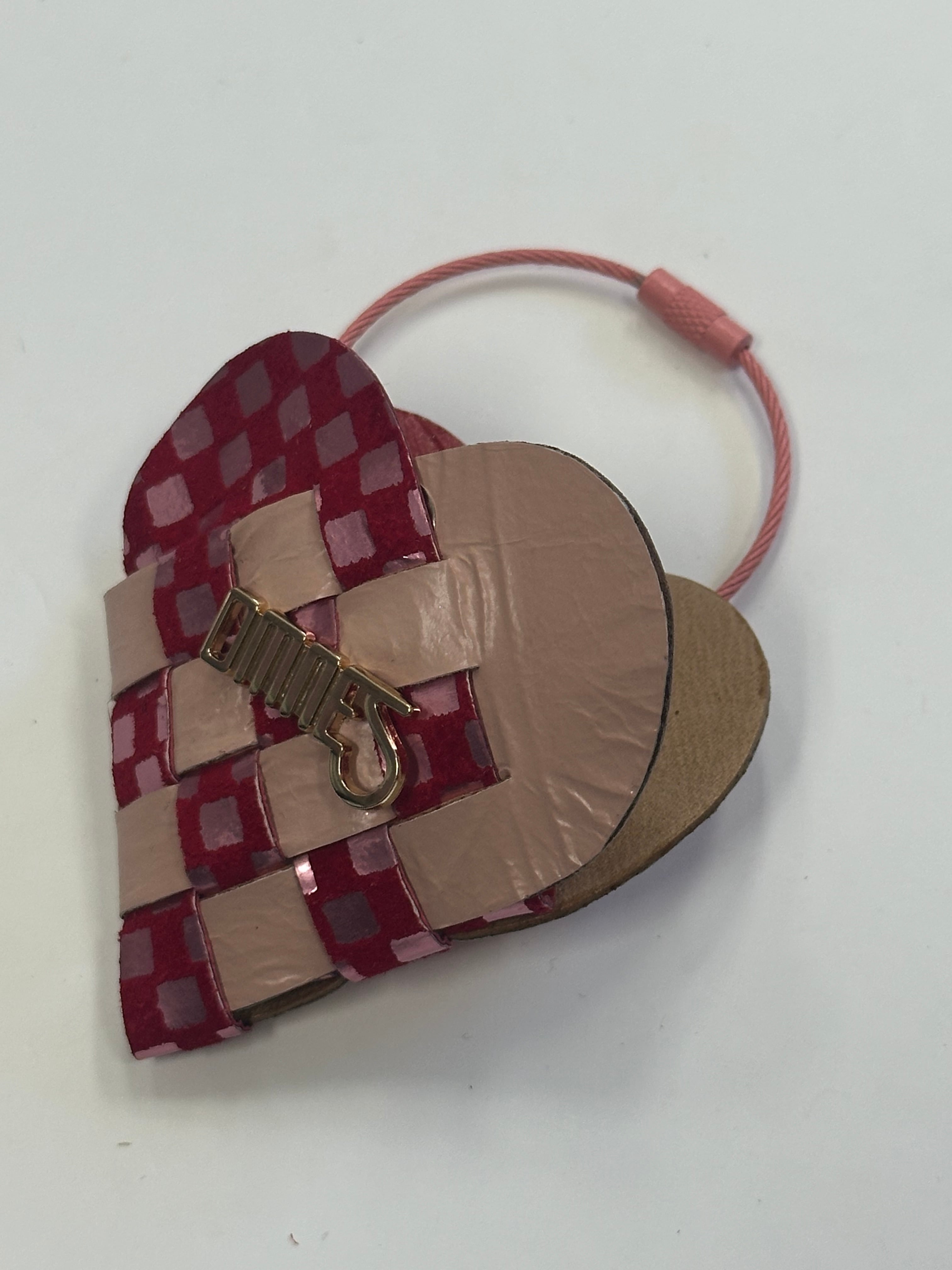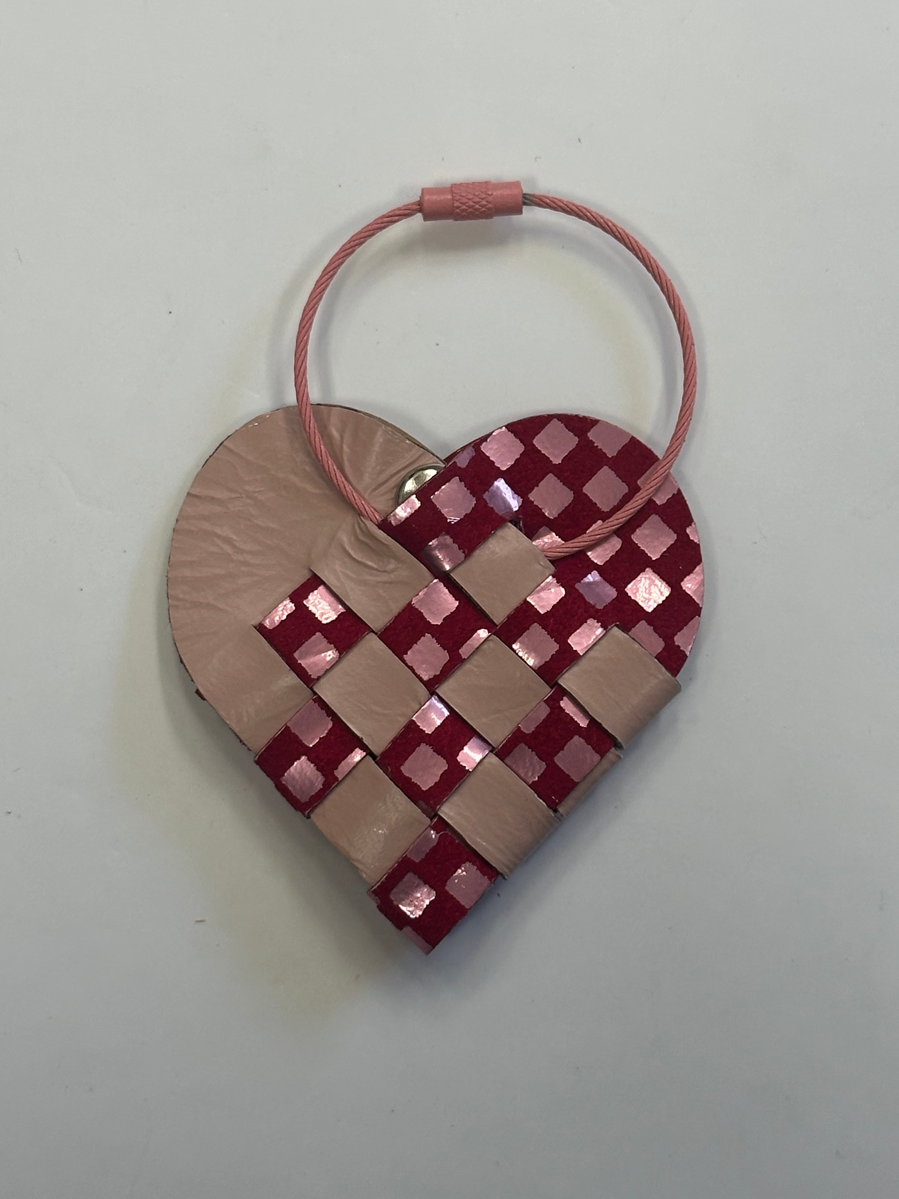 2枚の革を織り合わせて作られた小さなハートのキーリング。